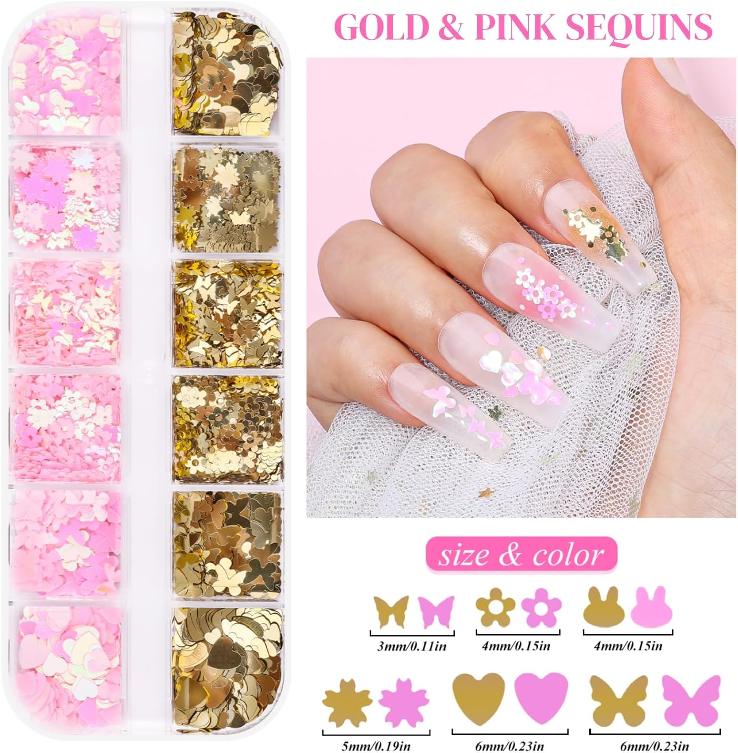 • Nail Sequins Decoration Kit: You'll get 5 boxes of mixed-shaped sequins (butterflies, hearts, stars, moons, flowers, diamonds, etc.), 1 pair of precision tweezers, and 1 pc of dual-end nail brush/dotting pen—everything you need for stunning nail art!