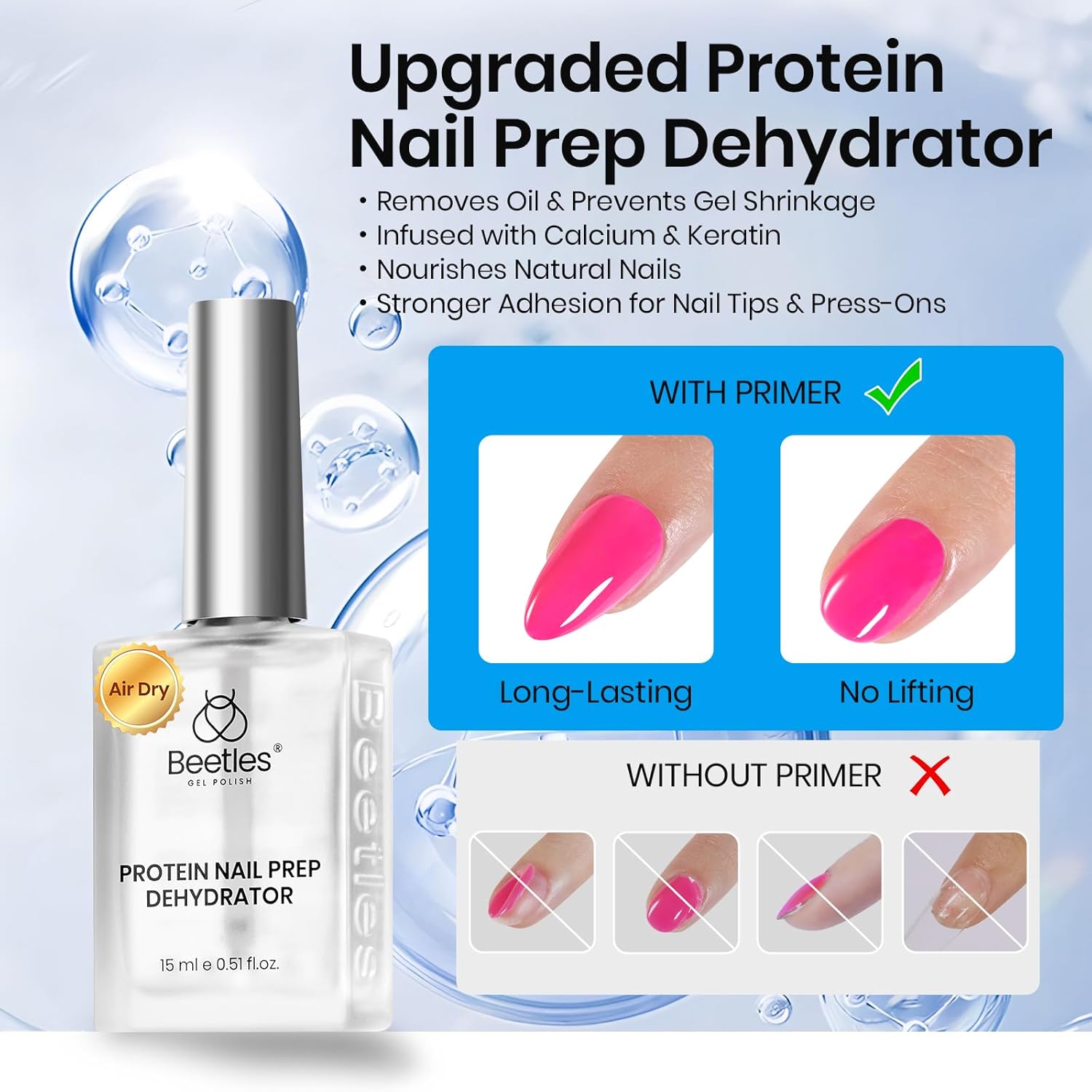 • Beetles 2 in 1 Protein Nail Dehydrator: Upgraded keratin formula, added 0.11% keratin, improves the adhesion of nail polish while nourishing your nails, making your nails healthier with use.Perfect for salon professionals and DIY users who want stronger adhesion and longer-lasting nails.