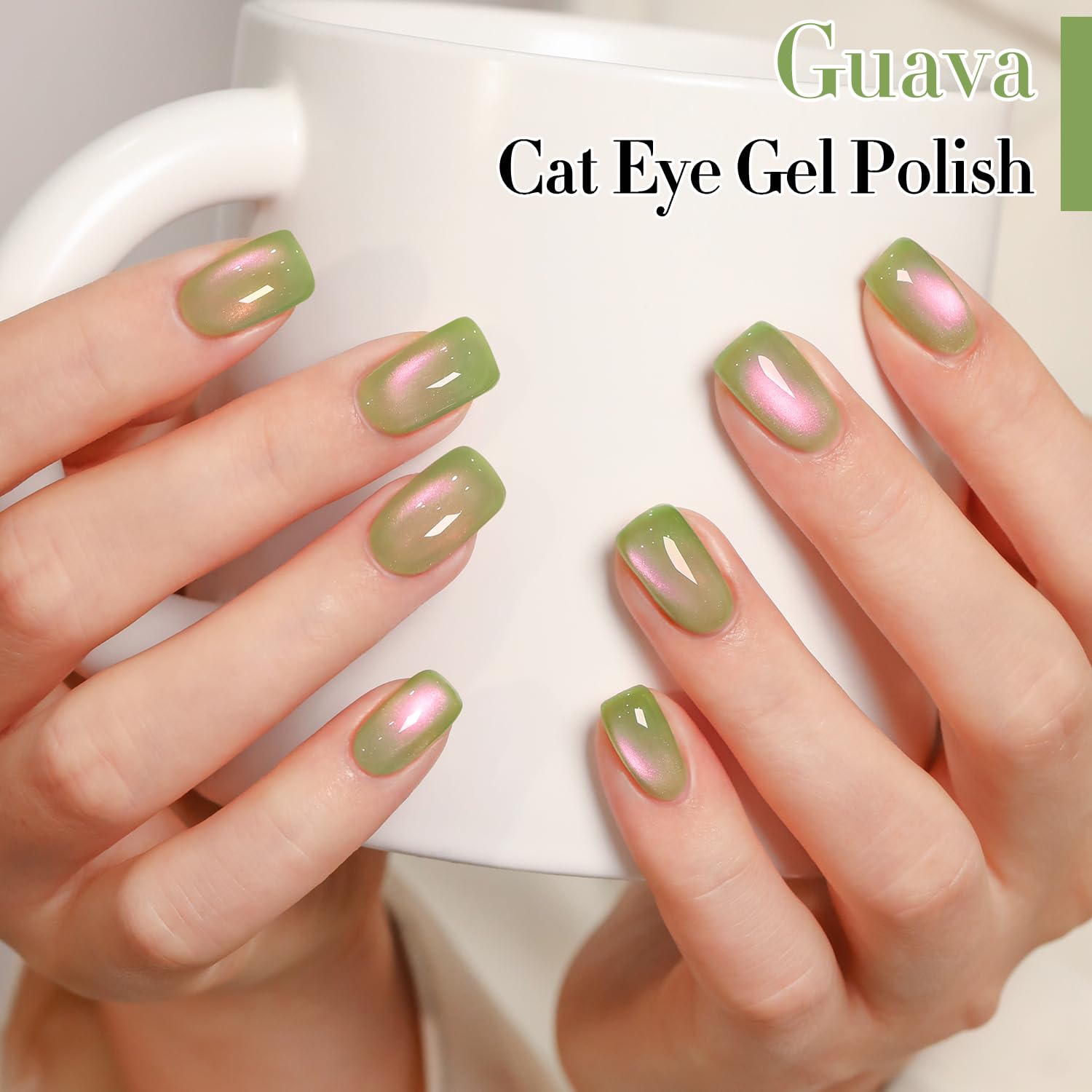 Double Rhythm 0.5 OZ Cat Eye Gel Polish with Magnet 15ML Holographic Glitter Shimmer Translucent Jelly Color Magnetic Nail Polish Salon DIY at Home (Pink Green-MC1215)