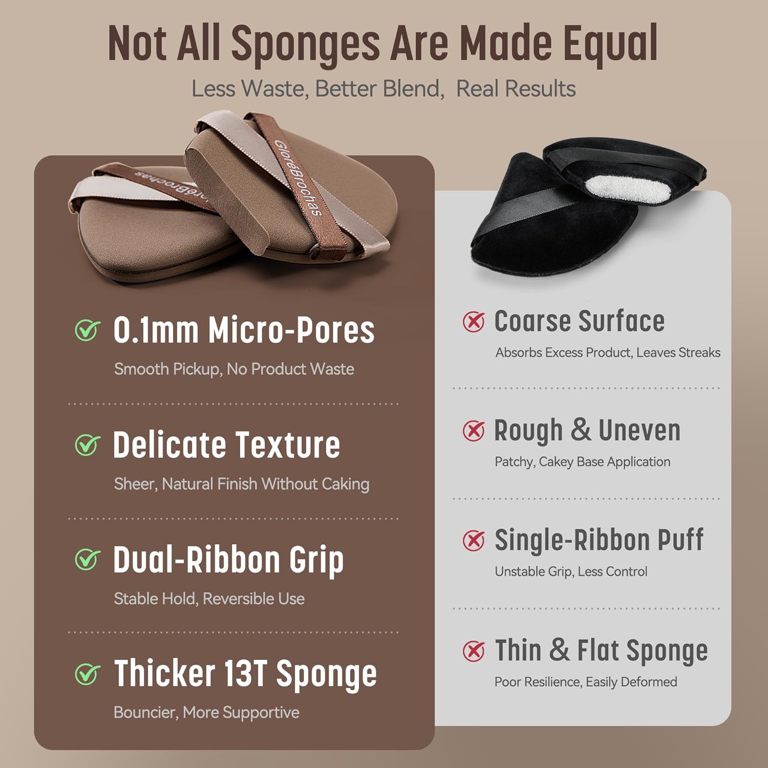 • 【Dual Ribbon Grip – Secure, Controlled, On-the-Go Ready】Unlike flimsy single straps, our dual-ribbon makeup puff offers a stable, ergonomic grip for all hand sizes—dry or damp. It gives you full control whether you're rushing to work or blending on the go.