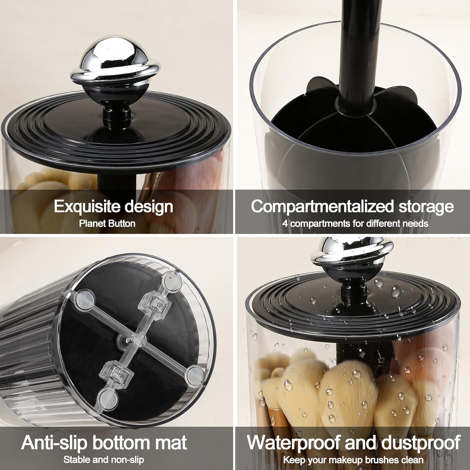 • 2.Large Capacity with 4 Slots:It has built-in 4 compartments with storage height up to 7.3in/18.5cm, which can help you sort your makeup brushes neatly.And the transparent material keeps your makeup brushes in order and clearly visible at all times.