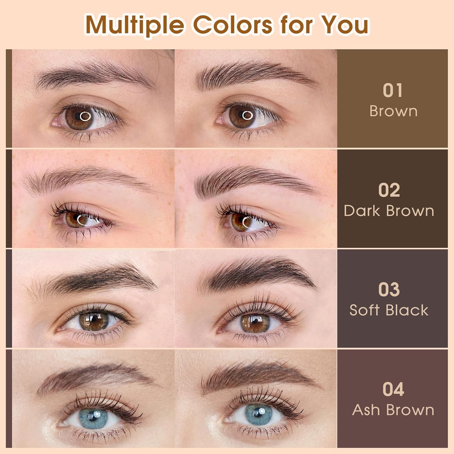 • ✔ 4 Natural Shades to Match Every Hair Color: 01 Brown, 02 Dark Brown, 03 Soft Black, 04 Ash Brown – from soft to bold brows, these smudge-proof shades offer a perfect match for all skin tones and hair colors