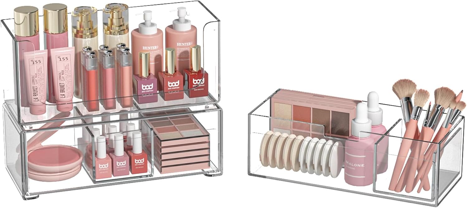 • DESKTOP ORGANIZER WITH DRAWERS: thanks to its two-in-one design, our clear organizer drawers storage box can be used as a drawer box to keep your daily essentials well organized and dustproof, or separated into two open storage holders without lids. This bathroom drawer organizer features a crystal clear body with a sleek cover for easy access and placing the items without obstruction