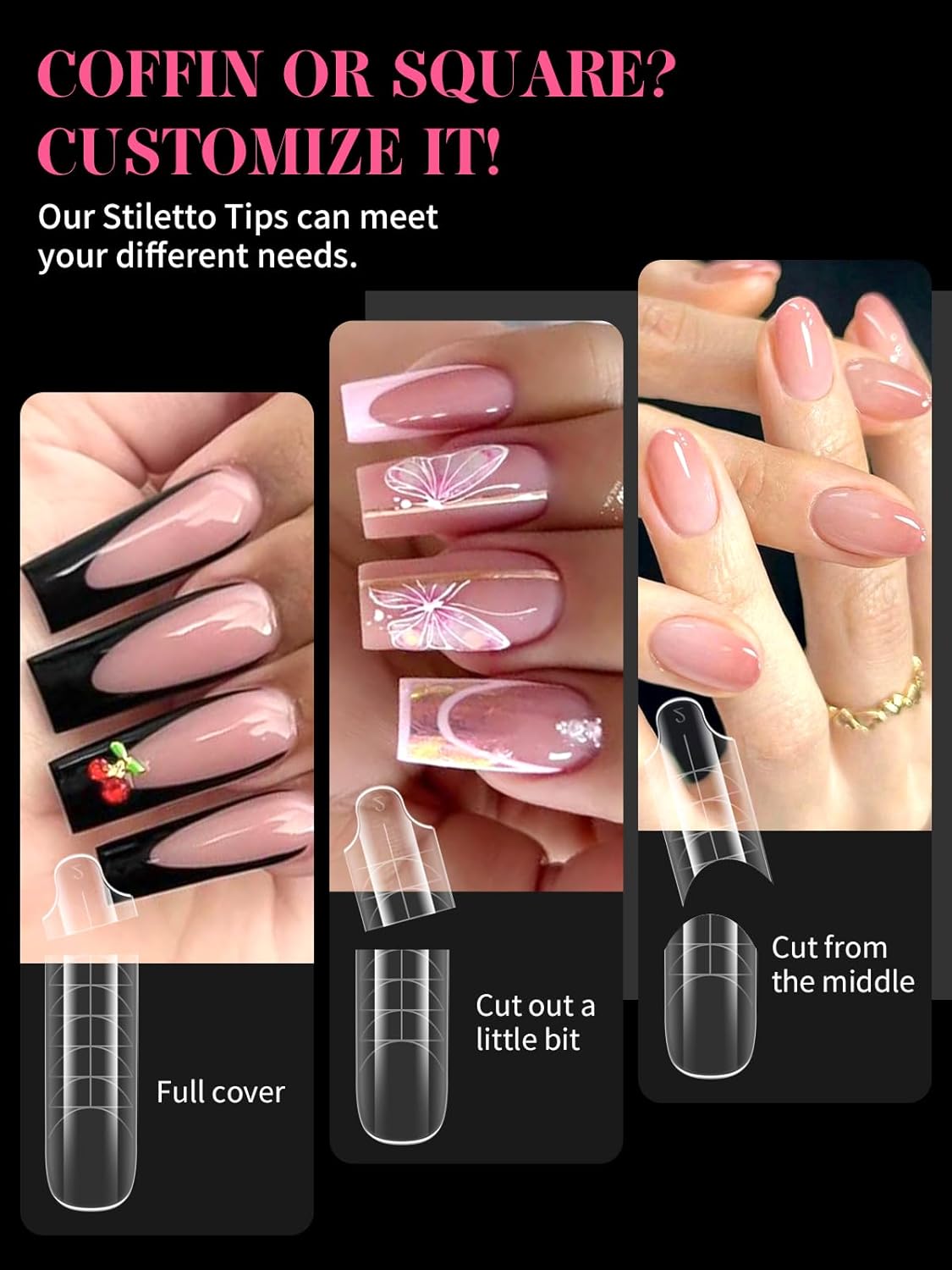 • 【Nail Form Mold with 15 Sizes】150pcs stiletto clear dual forms for poly nail gel offers 15 different nail sizes , and each size of long nail tips is separated by a small grid, a total of 15 grids, so they're easy and convenient to choose the suitable size to meet your nail's need.