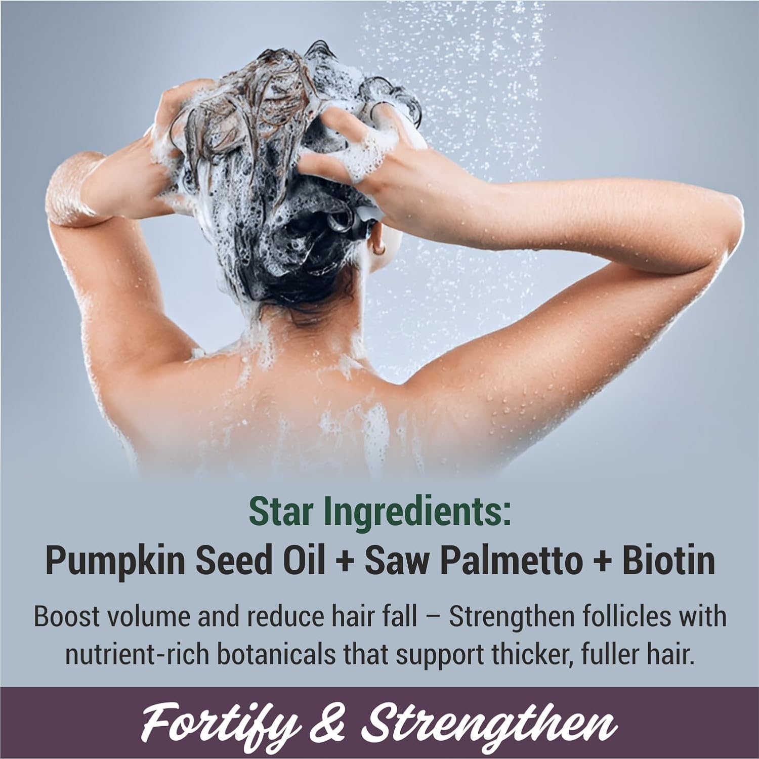• Botanical Shampoo with Biotin, Pumpkin Seed Oil & Saw Palmetto This plant-powered shampoo features a thoughtful blend of biotin, saw palmetto, and pumpkin seed oil, designed to support the appearance of stronger, fuller-looking hair. Ideal for daily use, it leaves your hair feeling refreshed and nourished. Suitable for all hair types and textures.