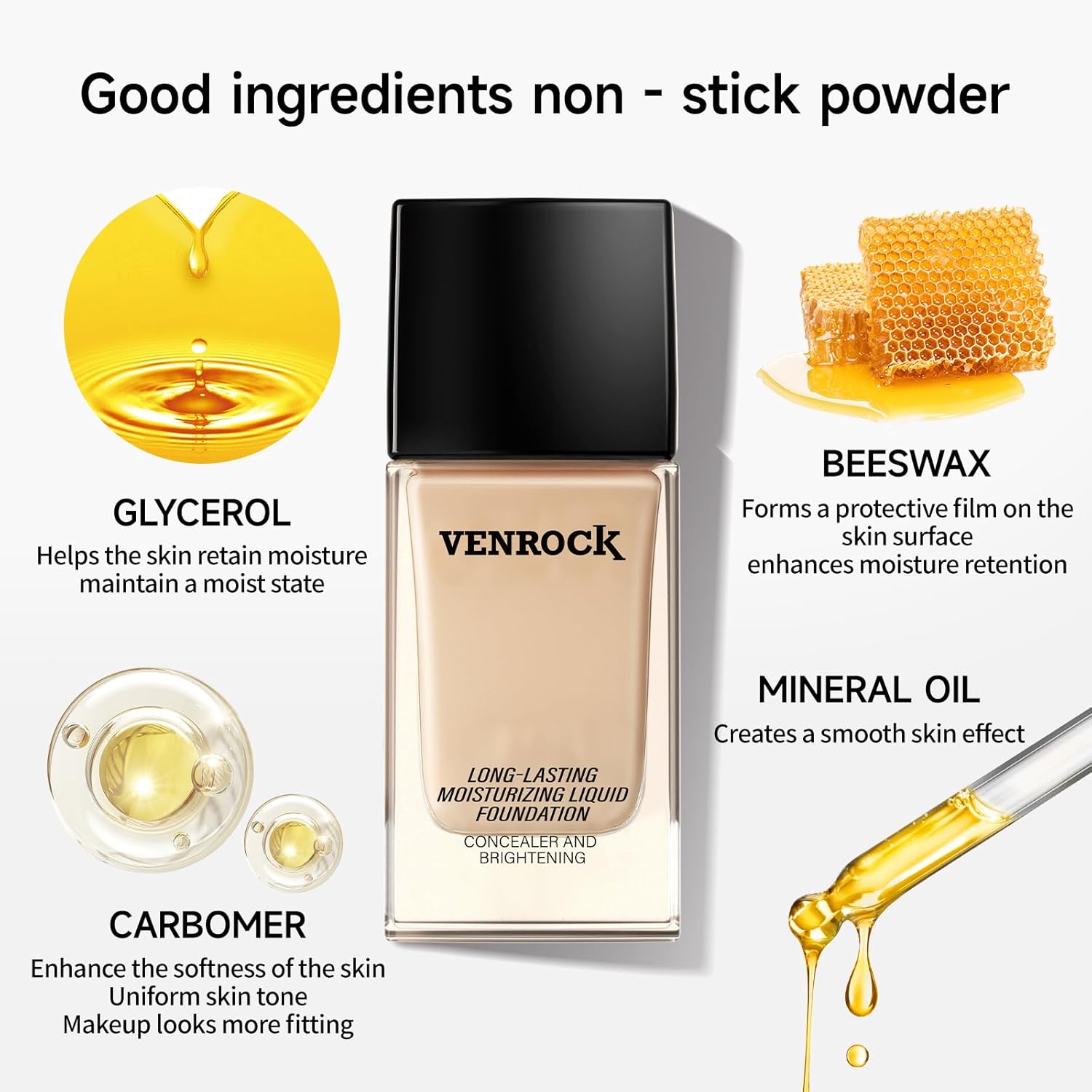VENROCK 24HR Long-Lasting Moisturizing Liquid Foundation | Radiant, Waterproof, Concealing & Oil-Control (01# Ivory White, 30ml)