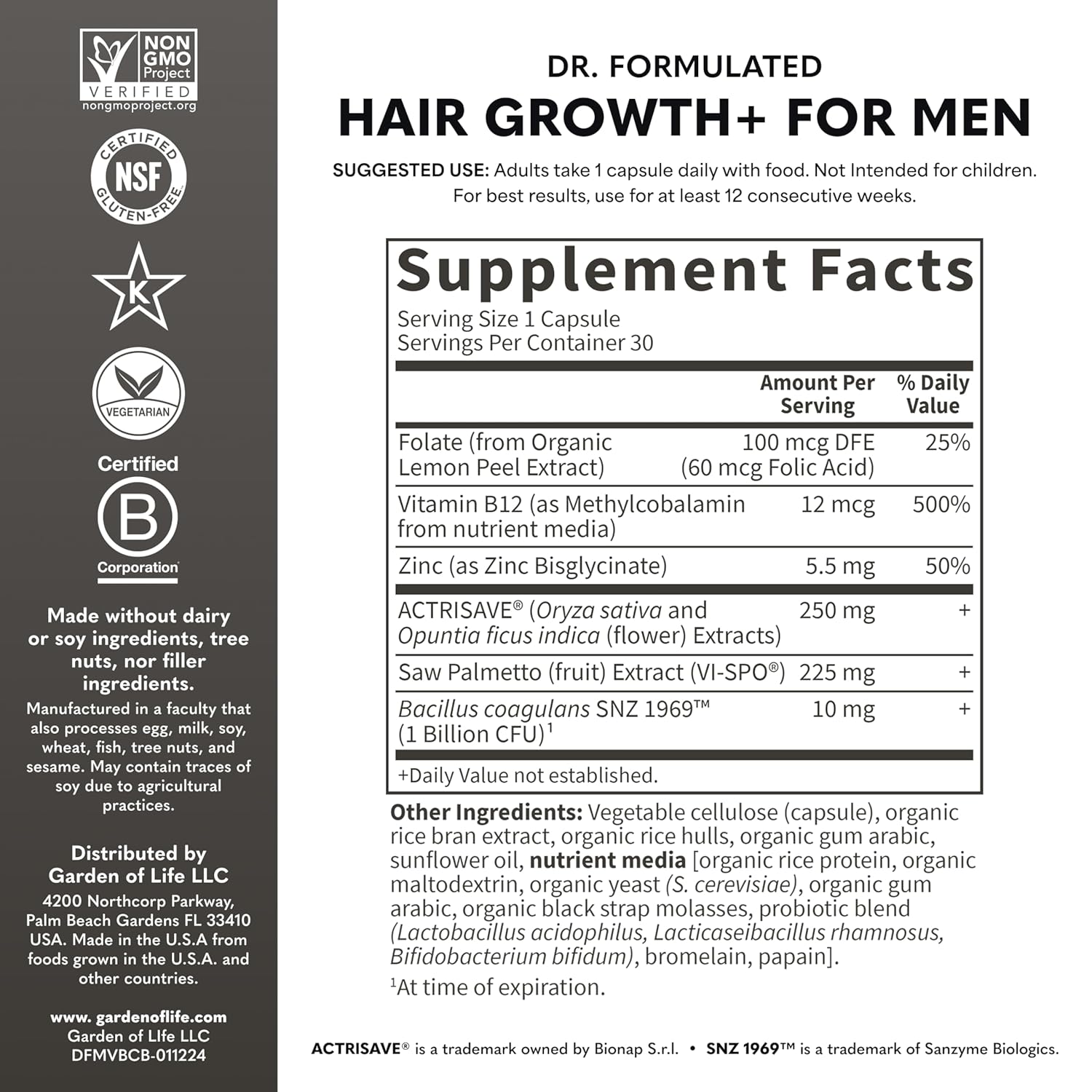 Garden of Life Dr. Formulated Hair Growth for Men with Clinically Studied Extracts and Saw Palmetto for Men to Support Men’s Hair Growth, 30 Count Vegetarian Capsules
