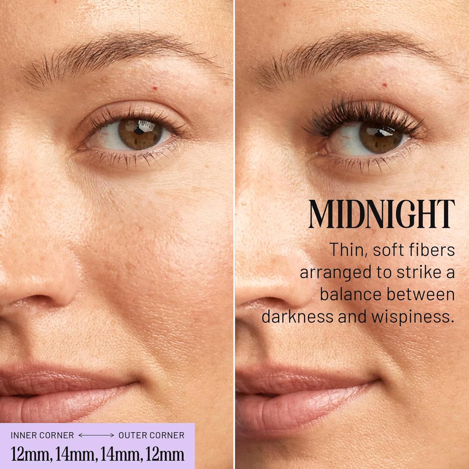 • Midnight Lashes - A dark, lush lash. Picture the same ultralight fibers from Originals, tightly clustered with a criss crossing flair for the perfect balance between drama and whimsy. Available in 10, 12, 14, and 16mm to find your ideal natural fit.