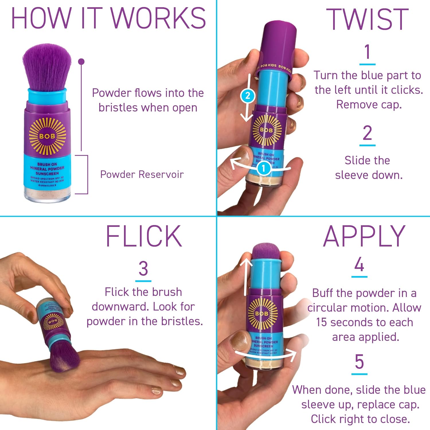 • Water Resistant: BOB KIDS powder sunscreen provides up to 80 Minutes of SPF 30 protection for your child when they are in the water or sweating; Reapply every 2 hours