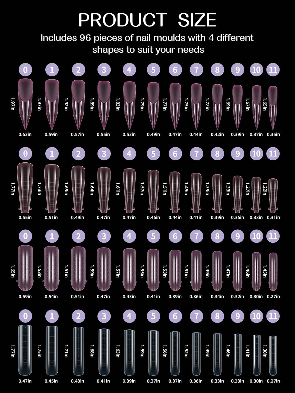 • 【12 Sizes of Nail Form Mold】96PCS coffin clear dual forms for poly nail gel offers 12 different nail sizes , and each size of long nail tips is separated by a small grid, a total of 12 grids, so they're easy and convenient to choose the suitable size to meet your nail's need.