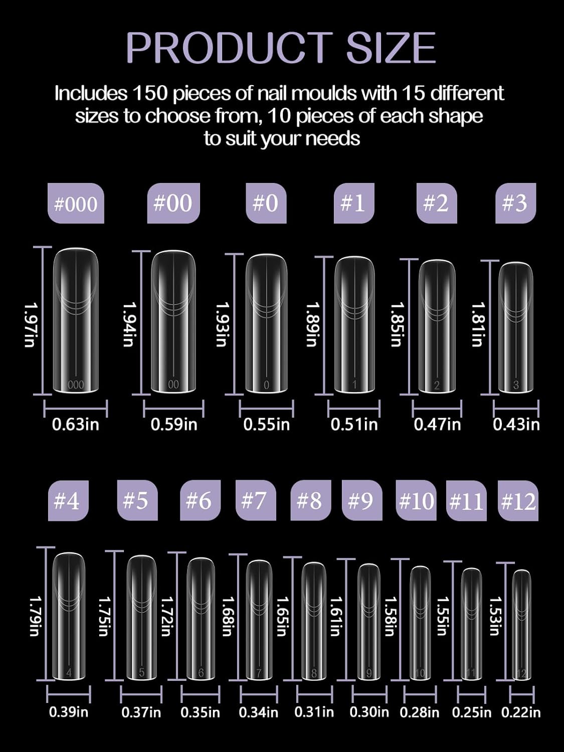 • 【15 Sizes of Nail Form Mold】150PCS coffin clear dual forms for poly nail gel offers 15 different nail sizes , and each size of long nail tips is separated by a small grid, a total of 15 grids, so they're easy and convenient to choose the suitable size to meet your nail's need.