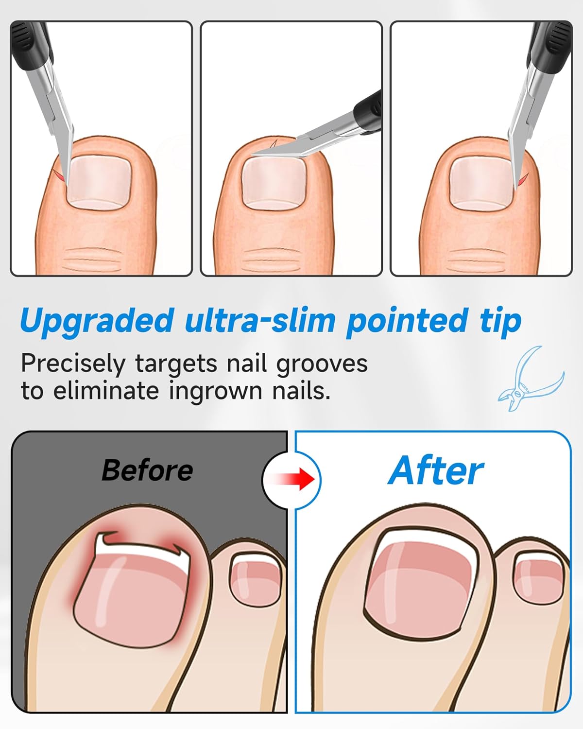 • 【Professional-Grade Precision Design】Engineered with an 18mm extended blade + 30° angled edge to effortlessly reach deep into nail grooves. Perfect for trimming ingrown toenails, thick nails,hangnails, and dead skin. The upgraded ultra-slim pointed tip targets embedded nails while dual-V blades power through hard nails.