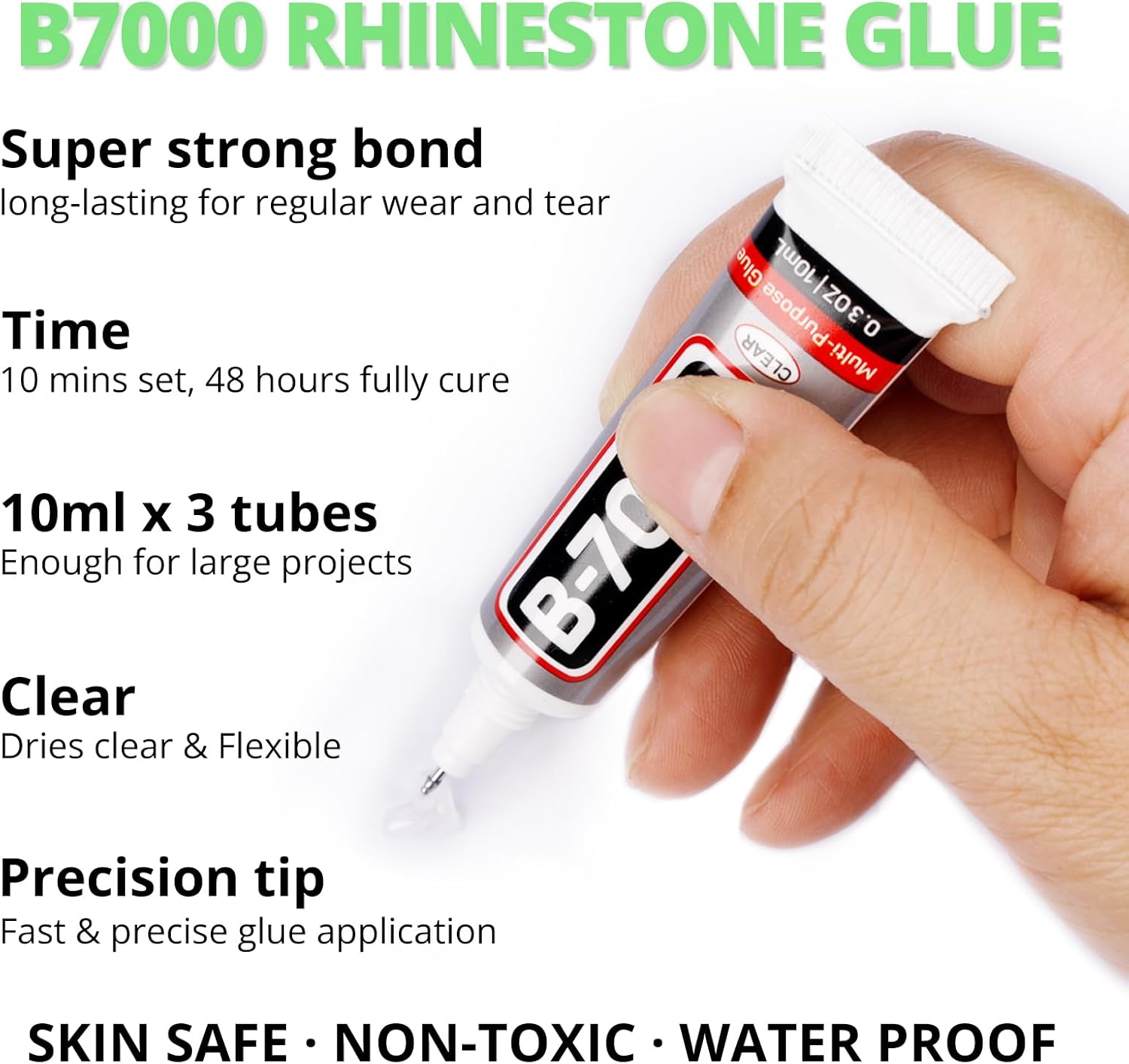 • B7000 Clear Glue for Gemstones -- B7000 glue has strong adhesion and dries clear, waterproof when dried, non-toxic and harmless to the skin. The glue has a precision needle for easy application, they can be applied precisely