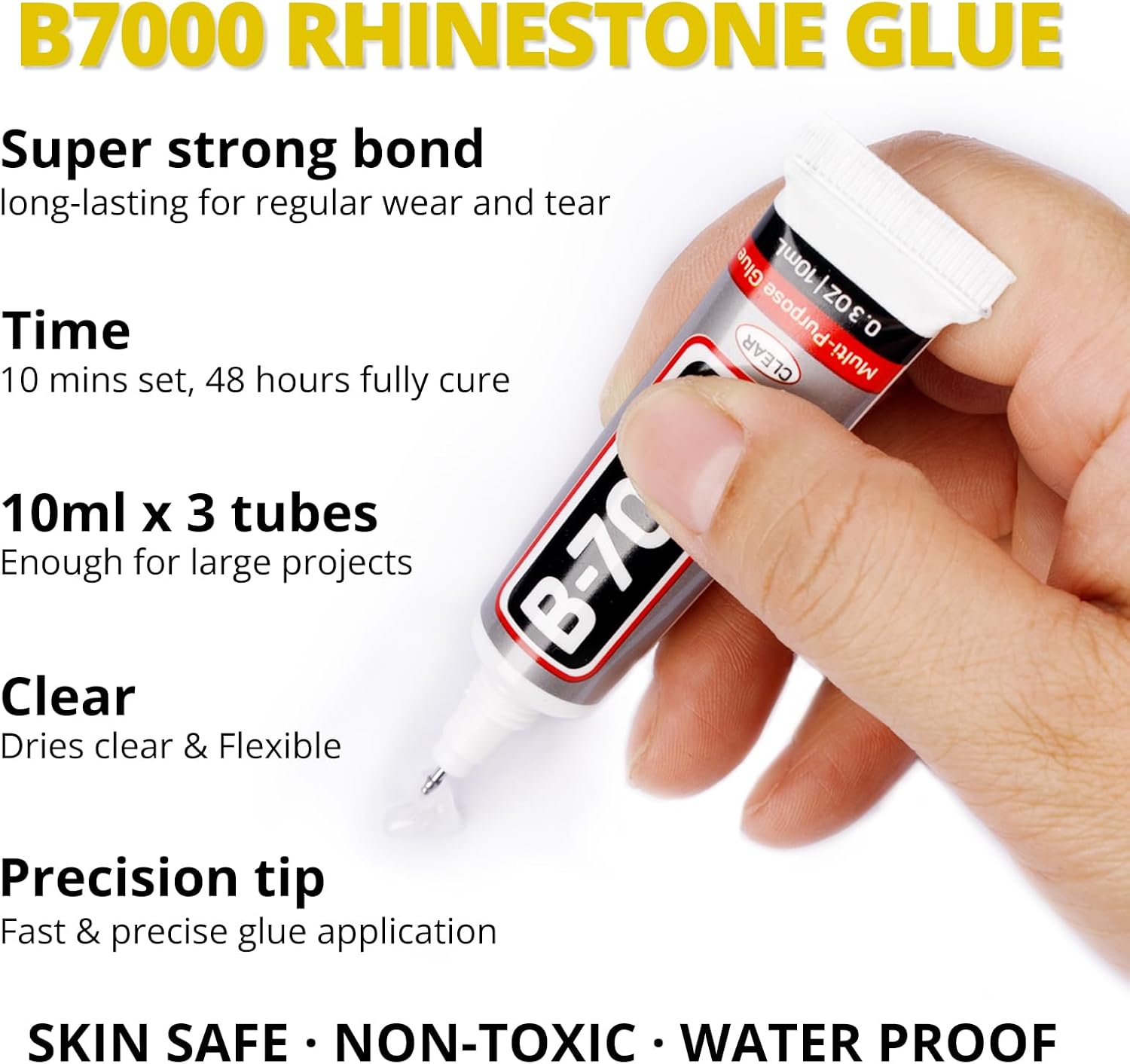 • B7000 Clear Glue for Gemstones -- B7000 glue has strong adhesion and dries clear, waterproof when dried, non-toxic and harmless to the skin. The glue has a precision needle for easy application, they can be applied precisely