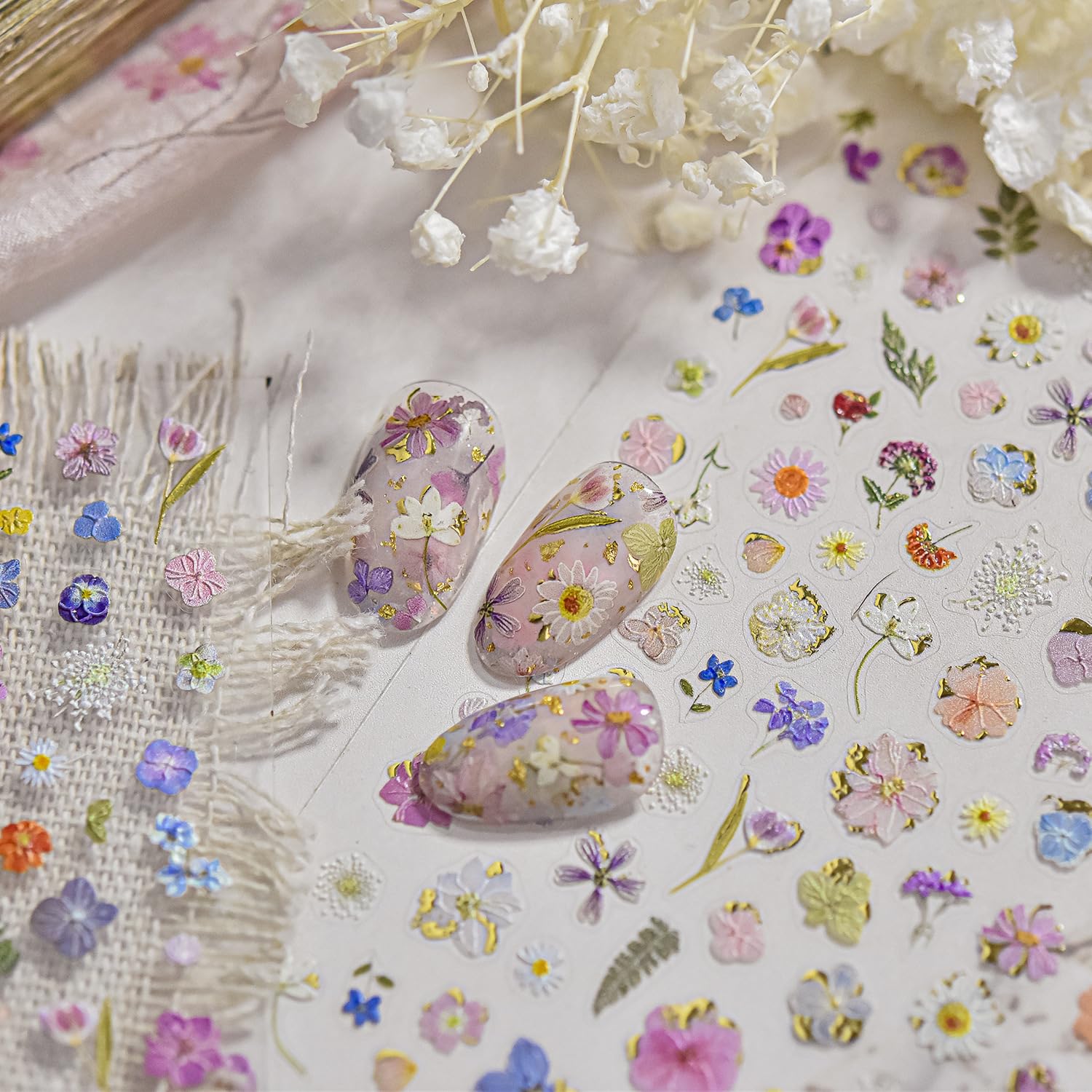 Flowers Nail Art Stickers Colorful Dried Flower Nail Decals 3D Self Adhesive Gold Foil Designs Spring Summer Nail Sticker Daisy Nail Stickers Cute Floral Nail Decal for DIY Nail Art Nails Decor Women