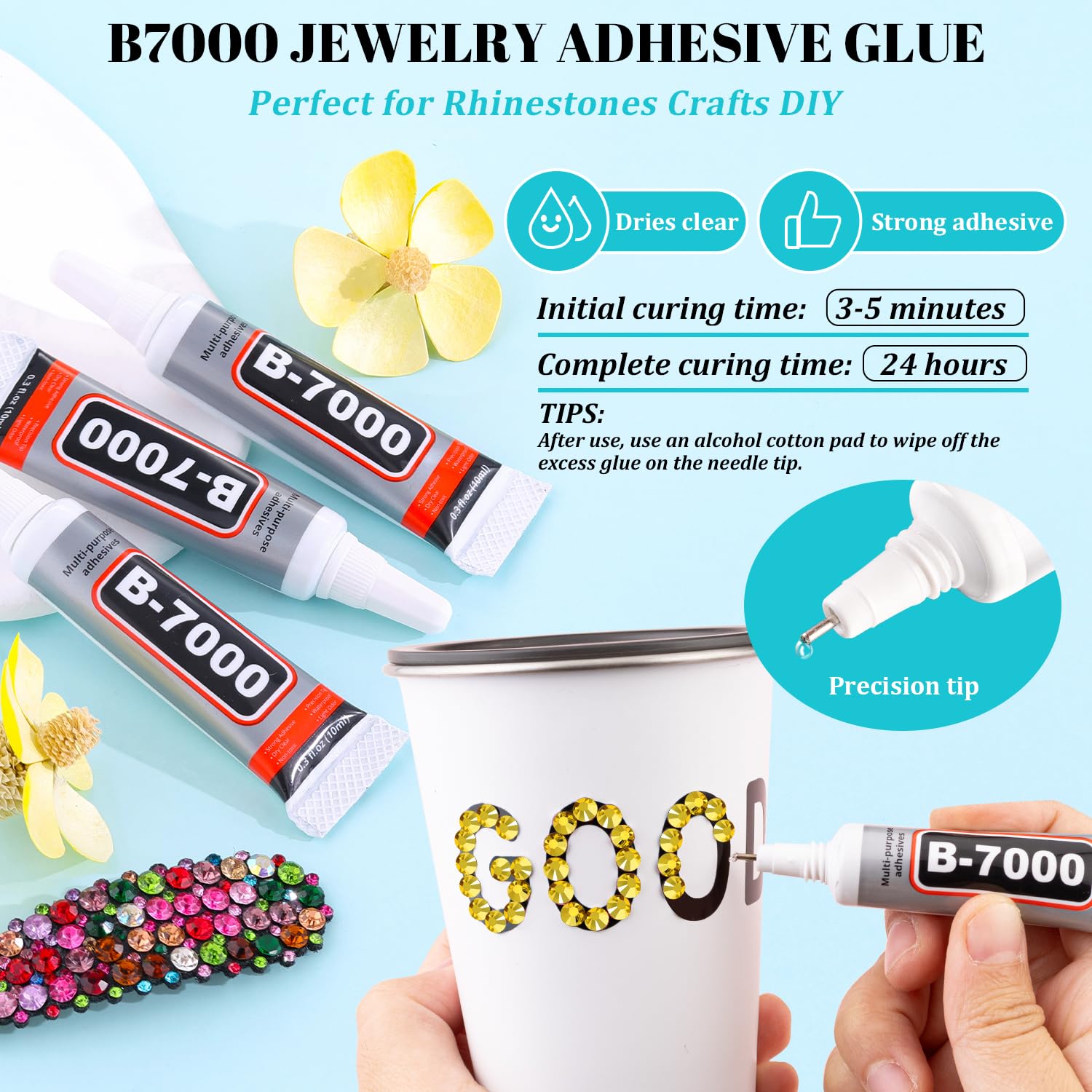 • STRONG B7000 GLUE FOR GEMS -- These Non-Hotfix rhinestones are not self-adhesive and need to be used by glue. The equipped B7000 glue has strong adhesion and dries clear. It has a precision needle for easy application. For first use, you can leave the glue head up for a few minutes before opening to avoid overflow. After use, the needle needs to be cleaned with an alcohol wipe so as to avoid a mess.