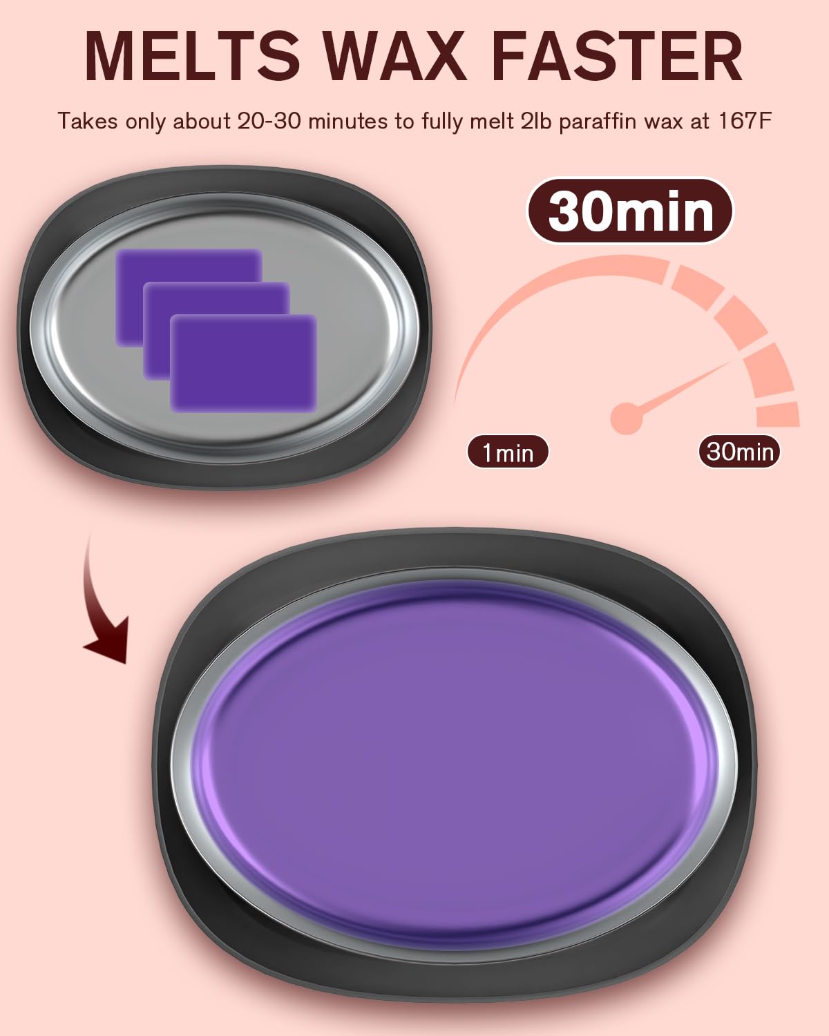 • Large Capacity / Quick Heat: paraffin wax machine has a large opening inner container , which offers you enough space to dip your hands, elbows or feet in paraffin warmer machine. Melts wax quickly and evenly , takes just 30 minutes to fully melt 2 lbs of paraffin wax at 167 °F. Turn Off the machine when dipping