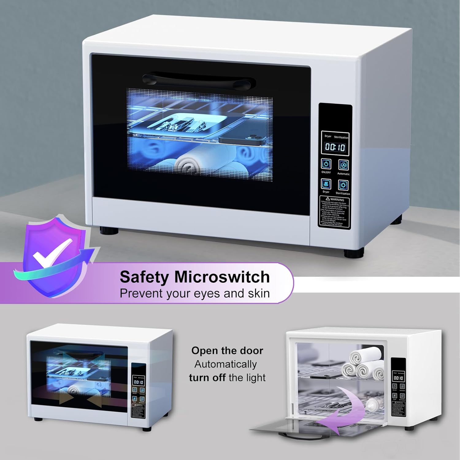 • Safety and Intelligent Cleaning Cabinet: The cleaner cabinet uses cleaning light, not generate heat. Coated glass door can avoid direct exposure to your eyes. Our nail tool cabinet has 3 smart options, all you have to do is select the desired mode and press the button and you're done in 30-60 minutes. Smart security switch sensing, the light will auto-off when the door open.This will protect you from damage