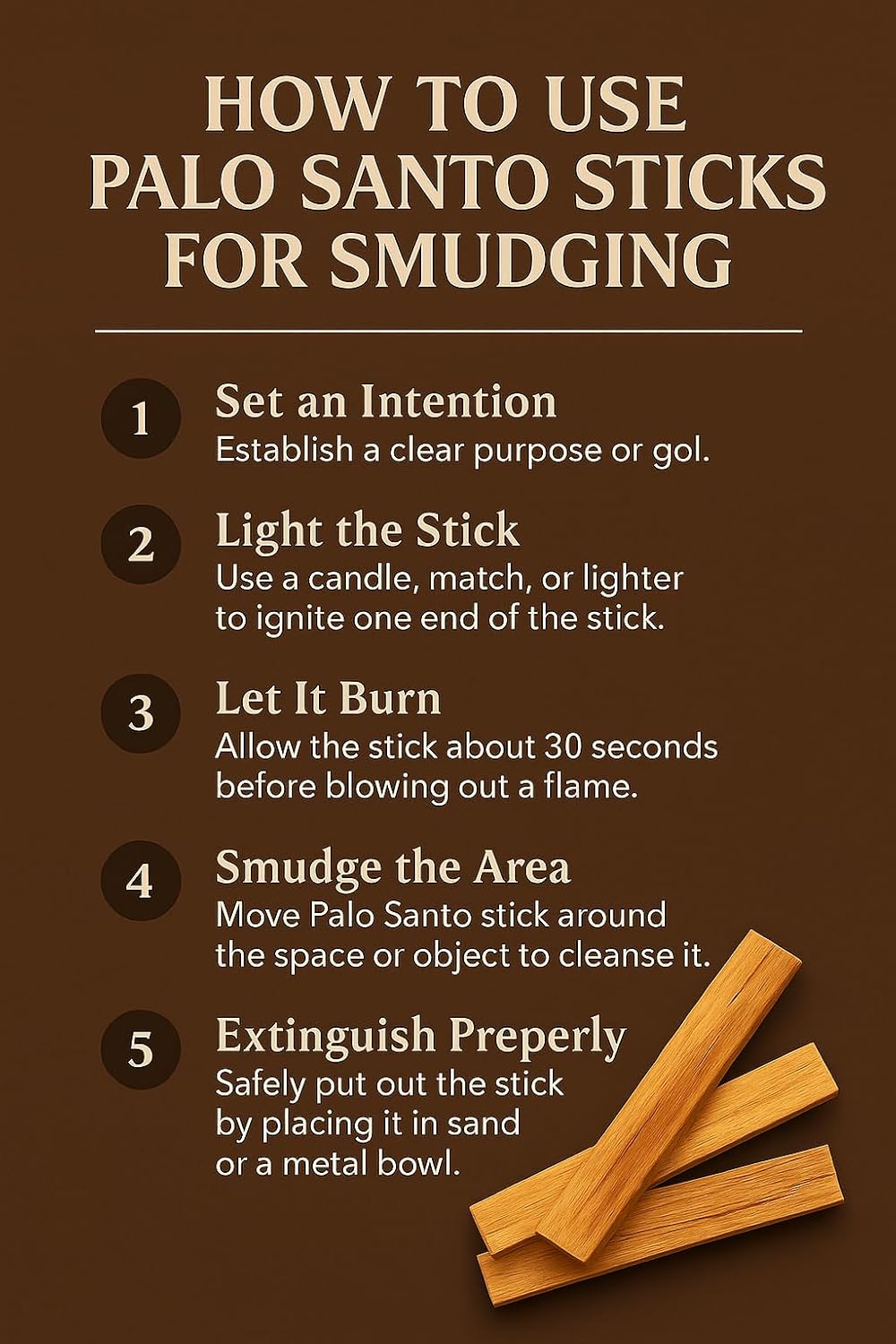 • ✅ Use a match or a lighter to ignite your Palo Santo. Hold your Palo Santo at a 45 degree angle with the point of the stick touching the flame. Let the wood stay lit for 30 seconds, and then blow the flame out. Allow the smoke to fill the space that you need to cleanse. When you are finished, lay the wood with the ignited tip downward in a bowl. It will put itself out.