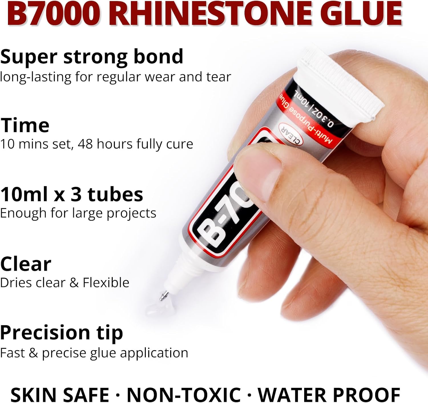 • B7000 Clear Glue for Gemstones -- B7000 glue has strong adhesion and dries clear, waterproof when dried, non-toxic and harmless to the skin. The glue has a precision needle for easy application, they can be applied precisely