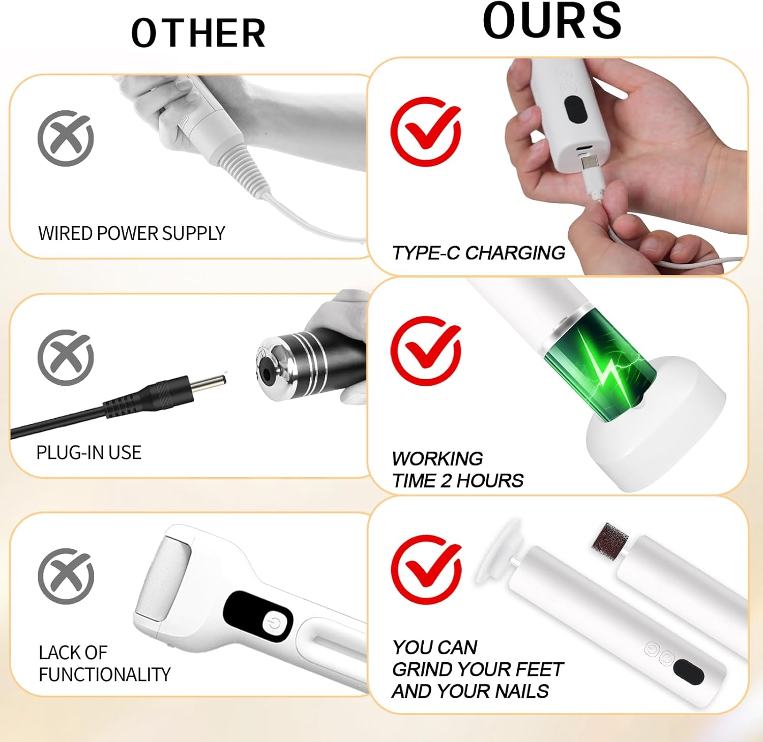 • 【Professional Smoothness in Minutes】Say goodbye to rough feet! Our 360° rotating electric callus remover delivers professional-level smoothness with its high-performance grinding head. It works like magic to effortlessly remove thick calluses and dead skin—no more soreness from manual scrubbing. Perfect for at-home spa sessions or as a gift for busy moms, travelers, or self-care enthusiasts