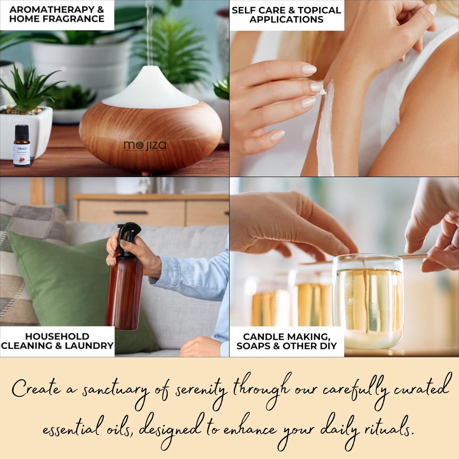 • AROMATHERAPY & NATURAL WELLNESS IN EVERY BOTTLE: Whether you're looking to relax, recharge, or refocus, MO'JIZA Essential Oils support your wellness journey. Their versatility makes them ideal for diffusers, massages, skincare and haircare routines, and DIY creations. An included booklet offers helpful tips on each oil and how to use them effectively.