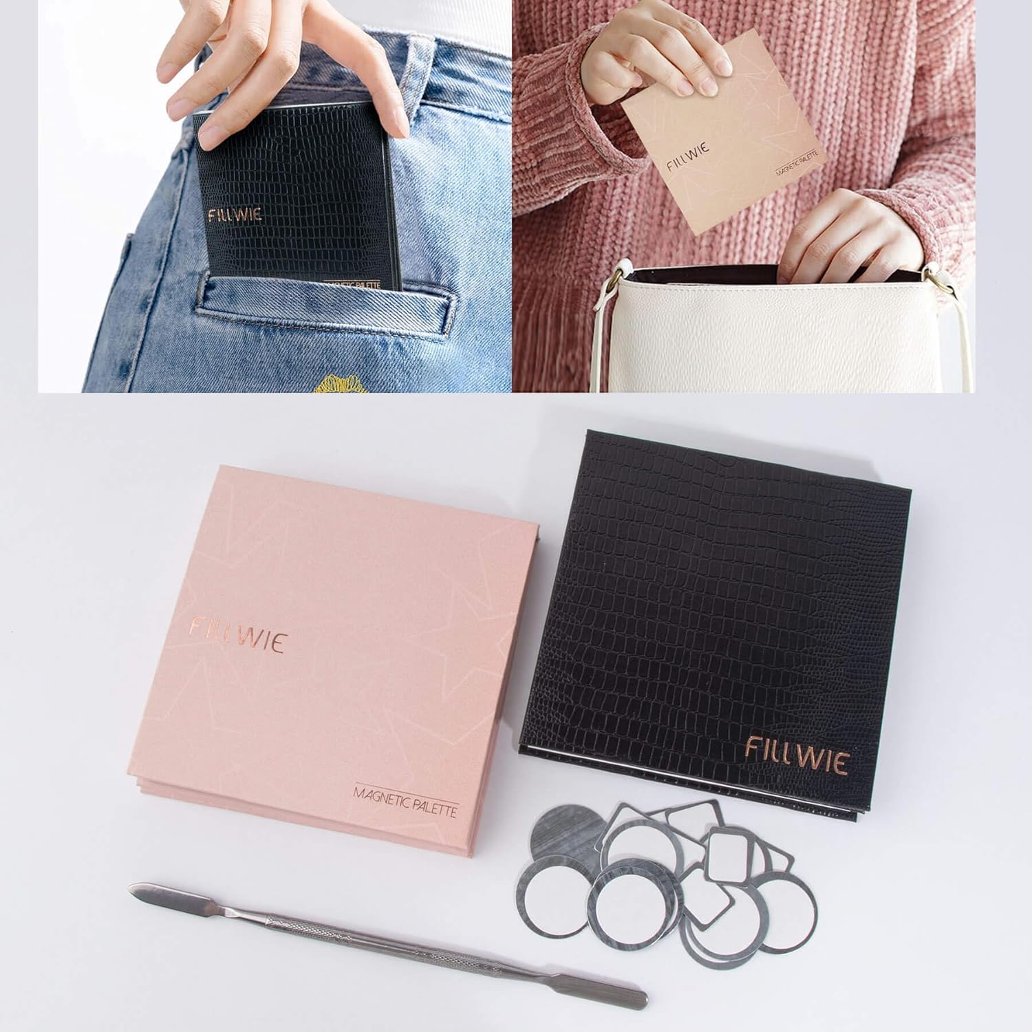 • Accessory Details: Comes with a mirror, long spatula (15.7 cm/6.18 in), and 10 round and 10 square metal stickers for non-magnetic pans. Mirror is secured at the palette’s bottom for easy use