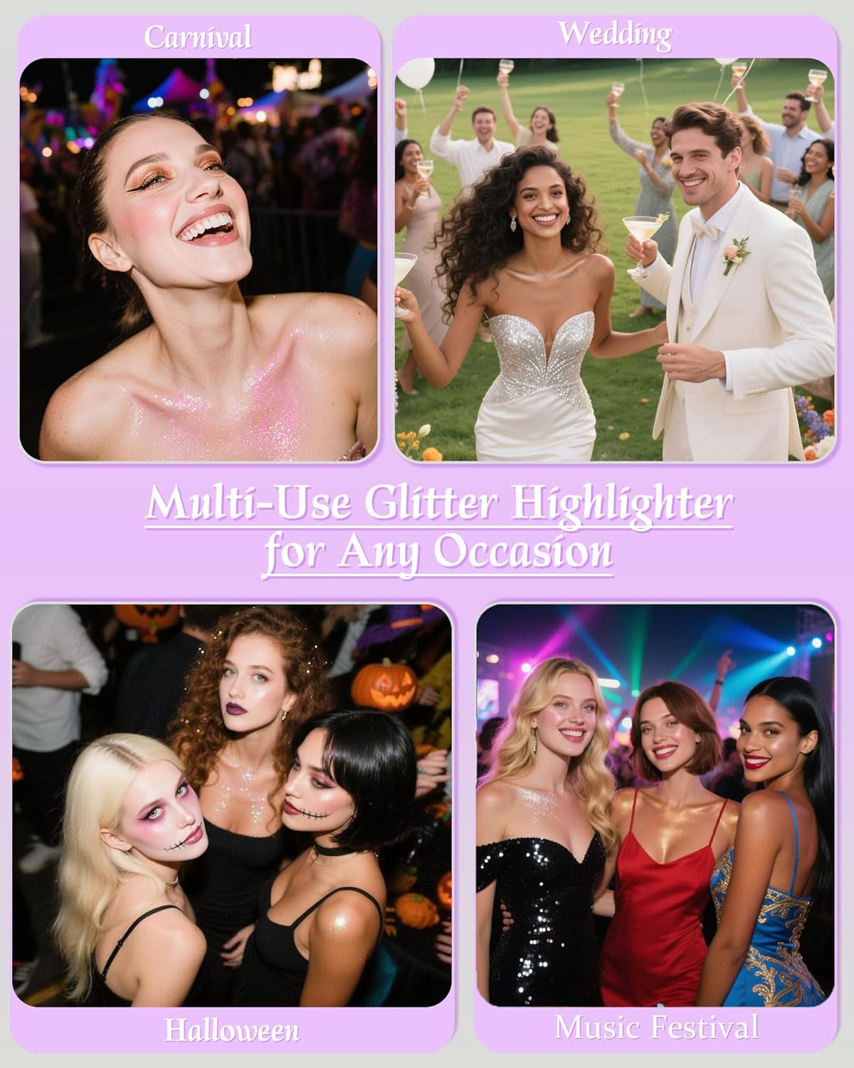 • Multi-Use Glitter Highlighter for Any Occasion:Glitter highlighters redefine versatility: use as face glitter, eyeshadow topper, or body glitter powder for festivals, weddings, or Halloween makeup. Compact size fits in clutch bags for travel-friendly touch-ups
