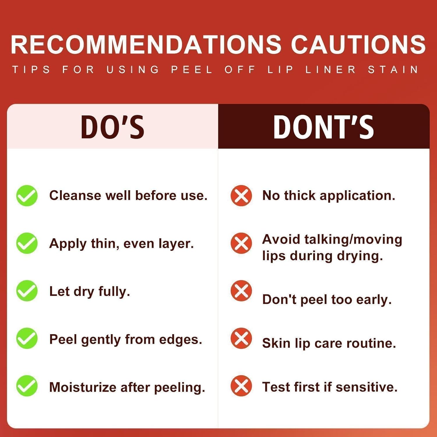 • Method of Use: First, wash and dry your lips. Lip liner stain works best on bare, clean skin (don't apply lipstick or other lip products before applying). Apply evenly along your lip line and let it sit for 20 minutes until it forms a film. Use your fingers to slowly peel off the top layer to create a moisturized lip. Finish with your favorite lip color.