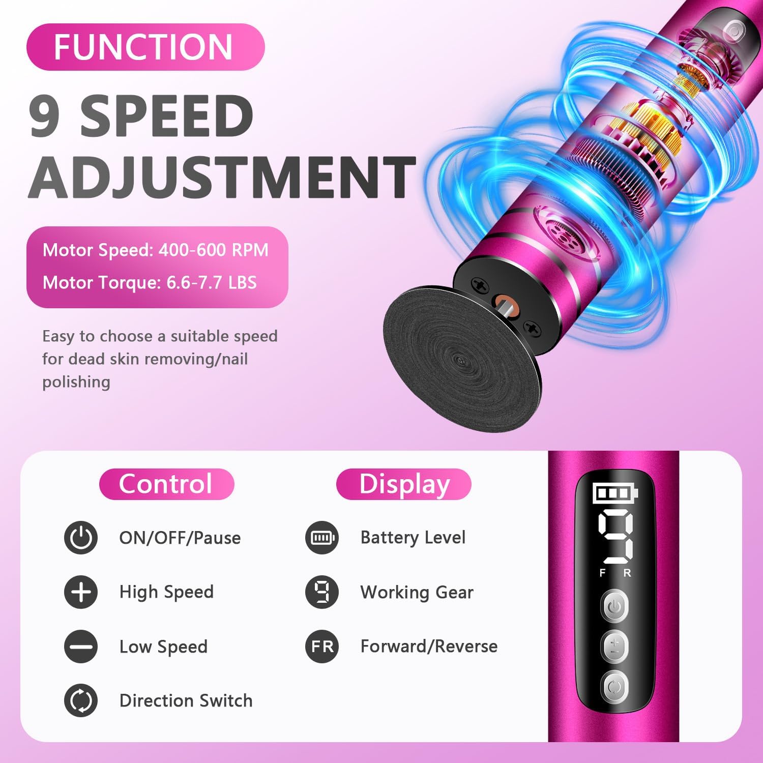 • ✅ 9 Adjustable Speeds (400-600 RPM) – There are 9 optional gears customize intensity from gentle to professional-grade, suitable for beginners & pros. Deep & Gentle Exfoliation, High-speed rotating heads effortlessly remove hard skin & calluses without irritation, leaving feet soft & smooth