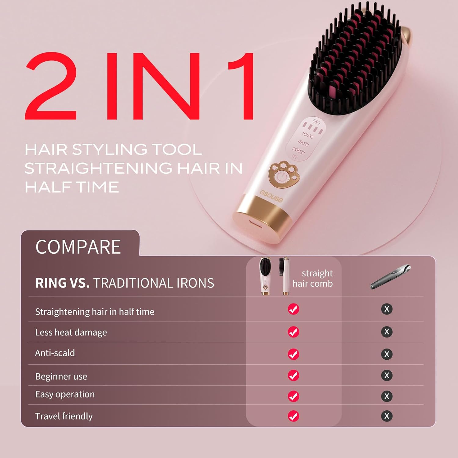 • TRAVEL-FRIENDLY CORDLESS FLAT IRON FOR EFFORTLESS STYLING ANYWHERE: Weighing just 8oz, the GSOUSG hair straightener brush features a cordless design that allows you to style your hair anywhere without searching for outlets or dealing with tangled cords. Perfect for styling before work, client meetings, and after workouts. *Please note: Charger not included.*