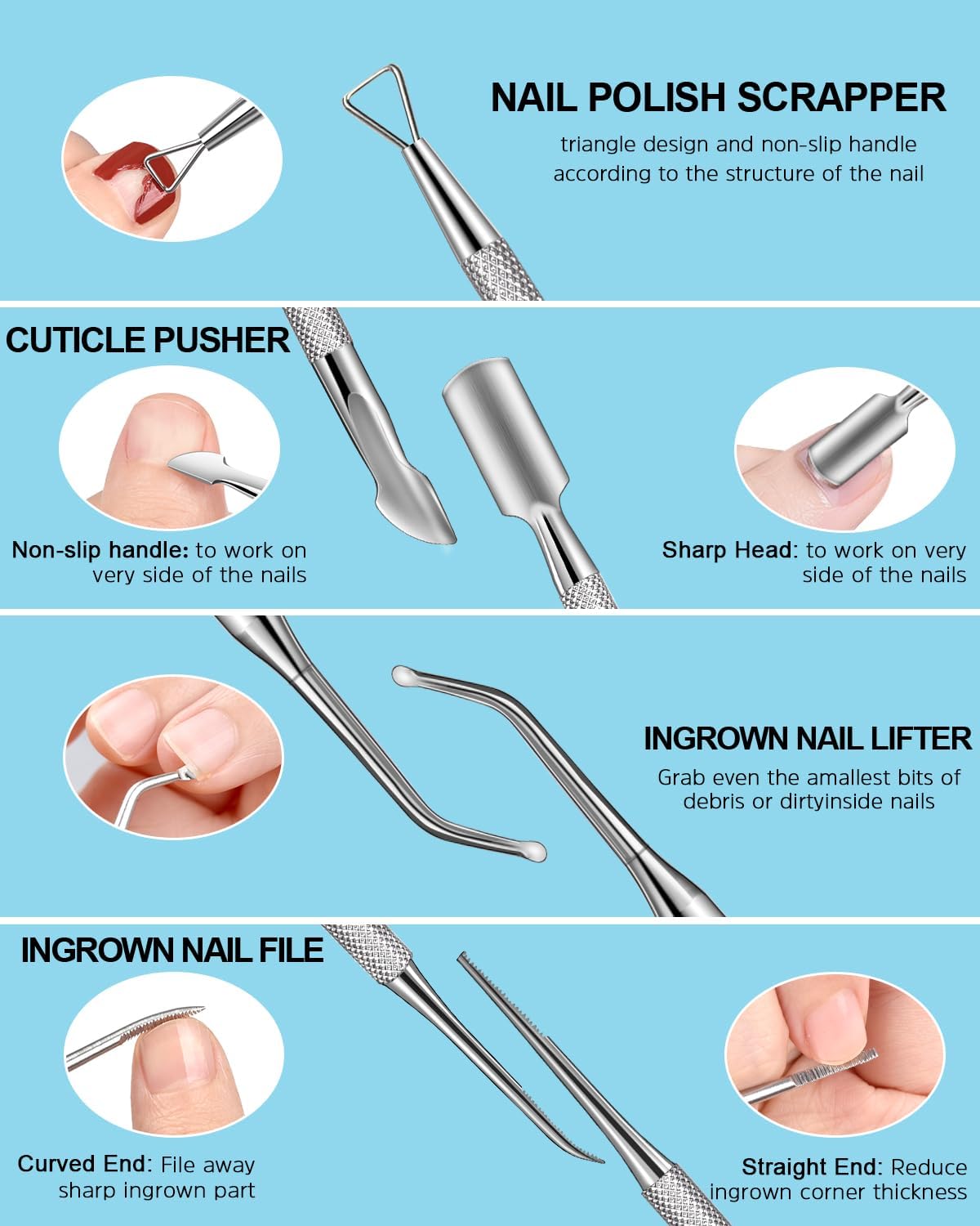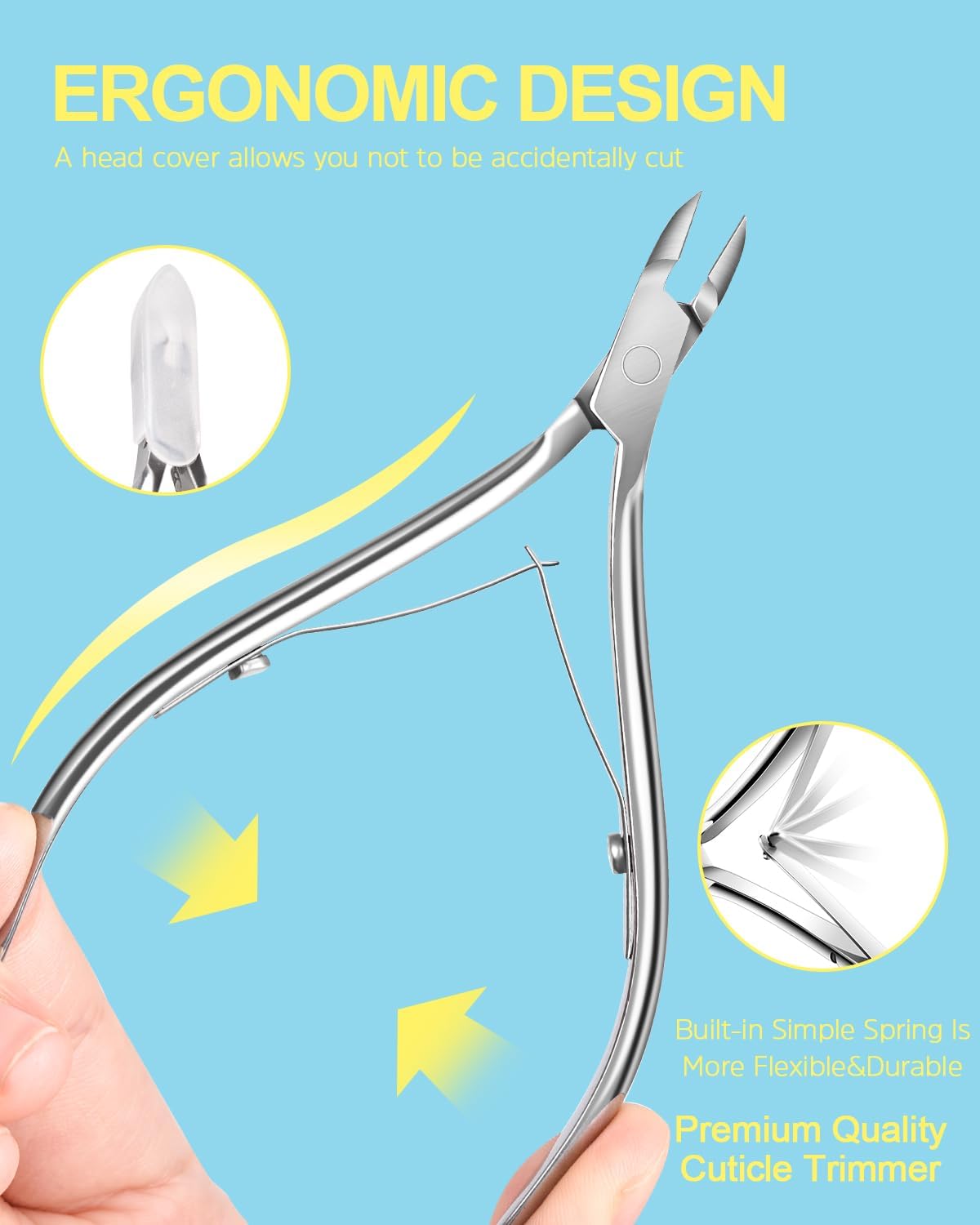 • Cuticle Trimmer Set: the stainless steel cuticle clippers for nails are sharper and more efficient for a long time, making sure that the cuticle are easily removed. Other 4 pcs manicure tools help you reach nail edge more easily to remove the stubborn debris effortlessly