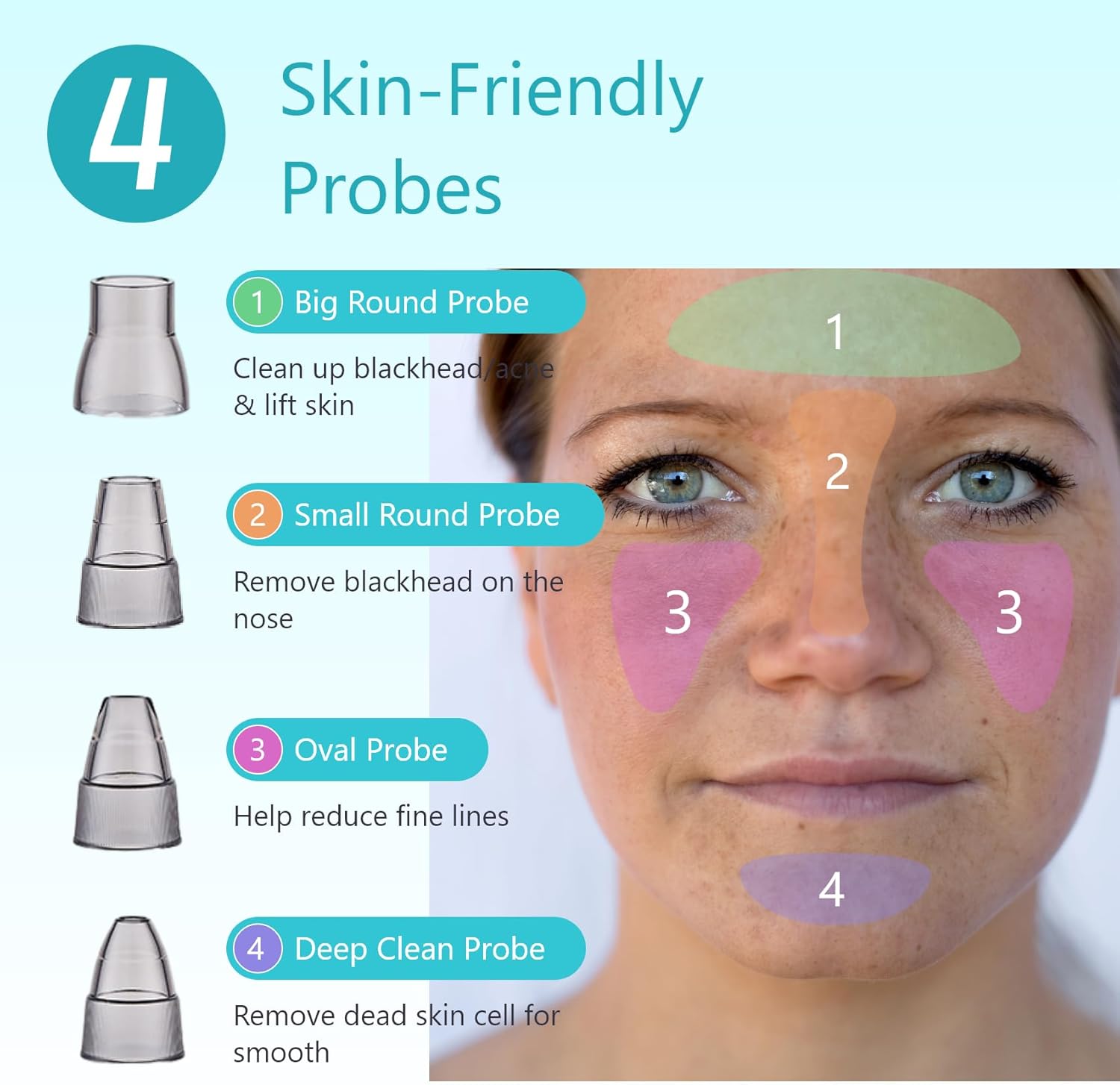 • Tips:Our Blackhead Remover Vacuum with 4 pcs interchangeable suction heads and includes 4 pcs bonus pimple popper tools. They can be rinsed with water to keep them clean