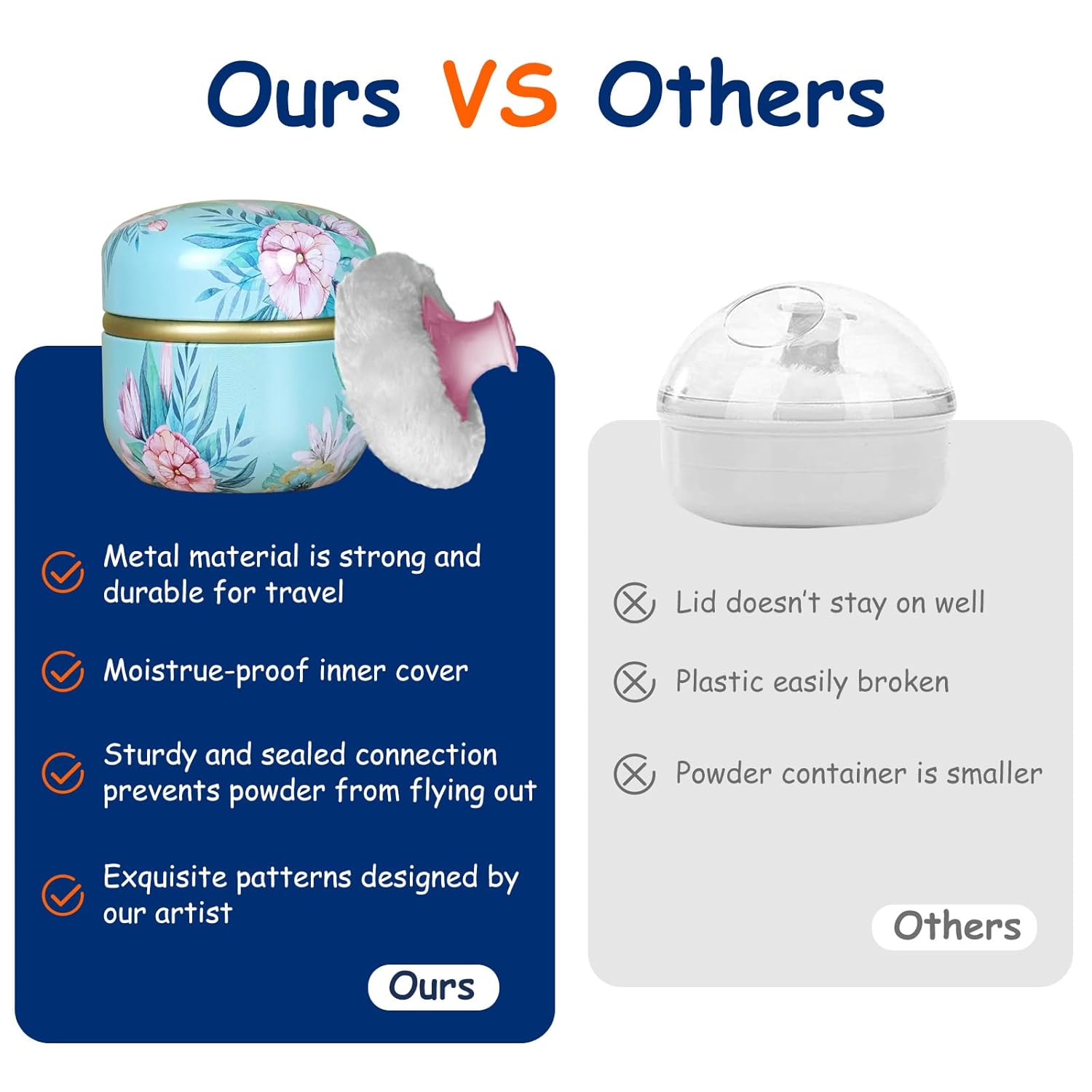 • CONVENIENT TO TRAVEL: the compact and strong powder container are convenient for daily home care, is also easy to carry and portable when traveling. don't worry about spilling powder. [how to use: please rotate it gently to open, don't use too much force to cause the powder to fly out. please press firmly to close]