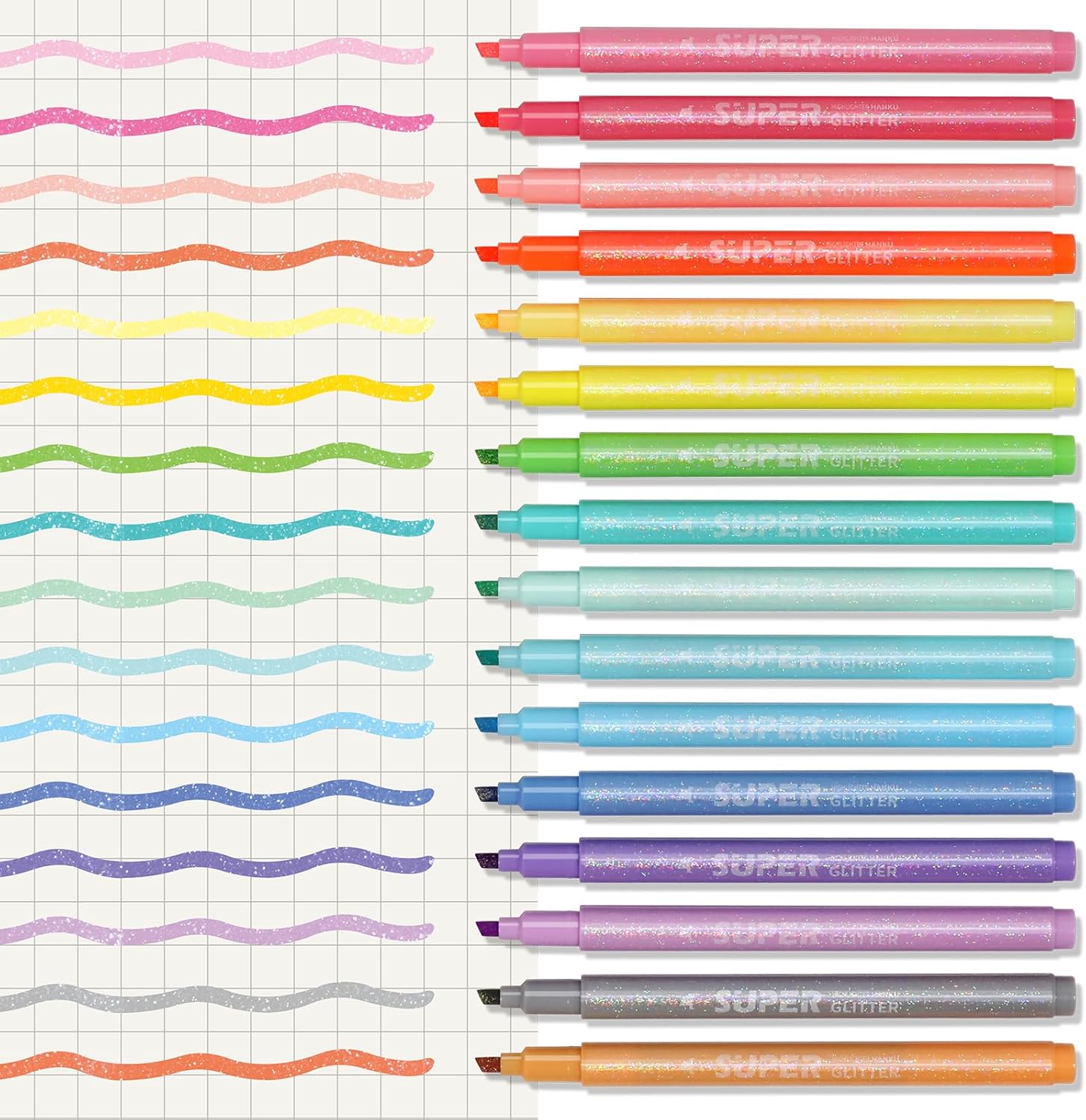 • 【Make your notes pop and your creativity sparkle】Our vibrant collection of ​​16 glitter highlighters​​ goes beyond ordinary marking. Illuminate your studies, journals, projects, scrapbooks, and planners with dazzling pastel & neon colors packed with shimmering sparkle