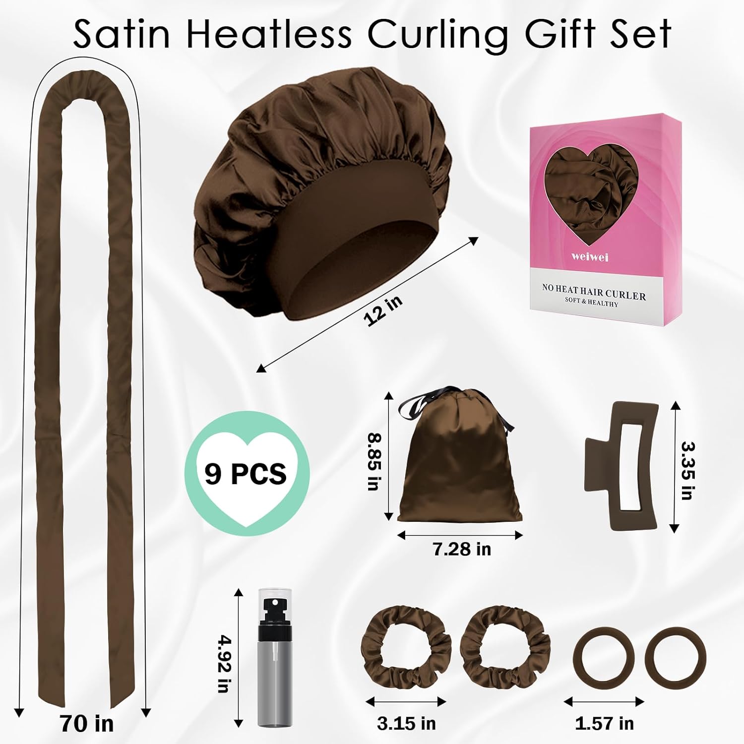 • 9 Pcs Heatless Curl Set: Includes 1 x 70" satin hair curler, 1 x satin hair bonnet, 1 x hair clip, 2 x satin scrunchies, 2 x elastic hair ties, 1 x satin storage bag, and 1 x spray bottle. Packaged in a beautiful box, it's the perfect present for her