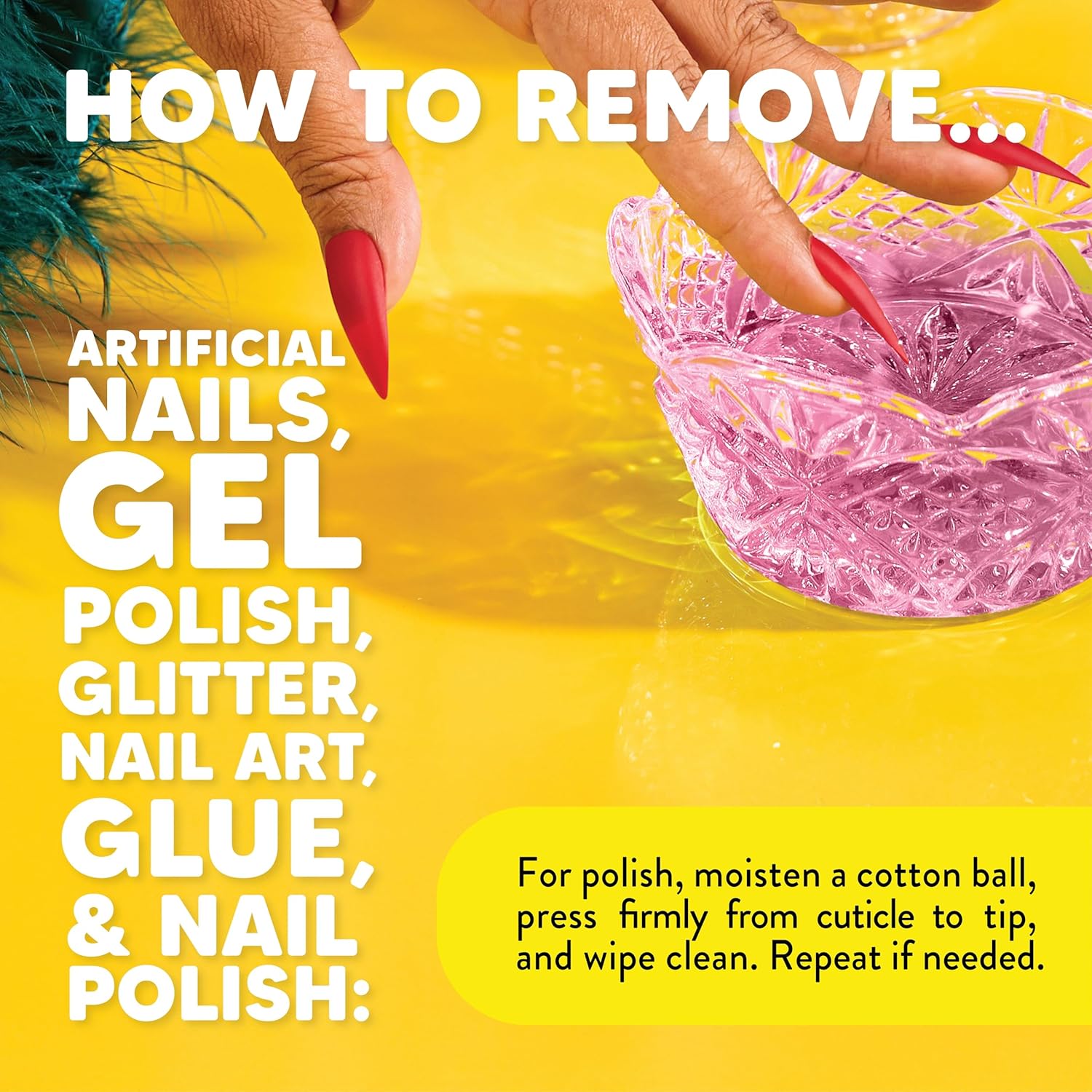 • Directions: Simply clip the artificial nails, and soak your fingers in a bowl of the nail remover for 15 minutes. Gently file down the softened product and soak for another 15. For regular polish, Moisten cotton balls and massage the nail bed