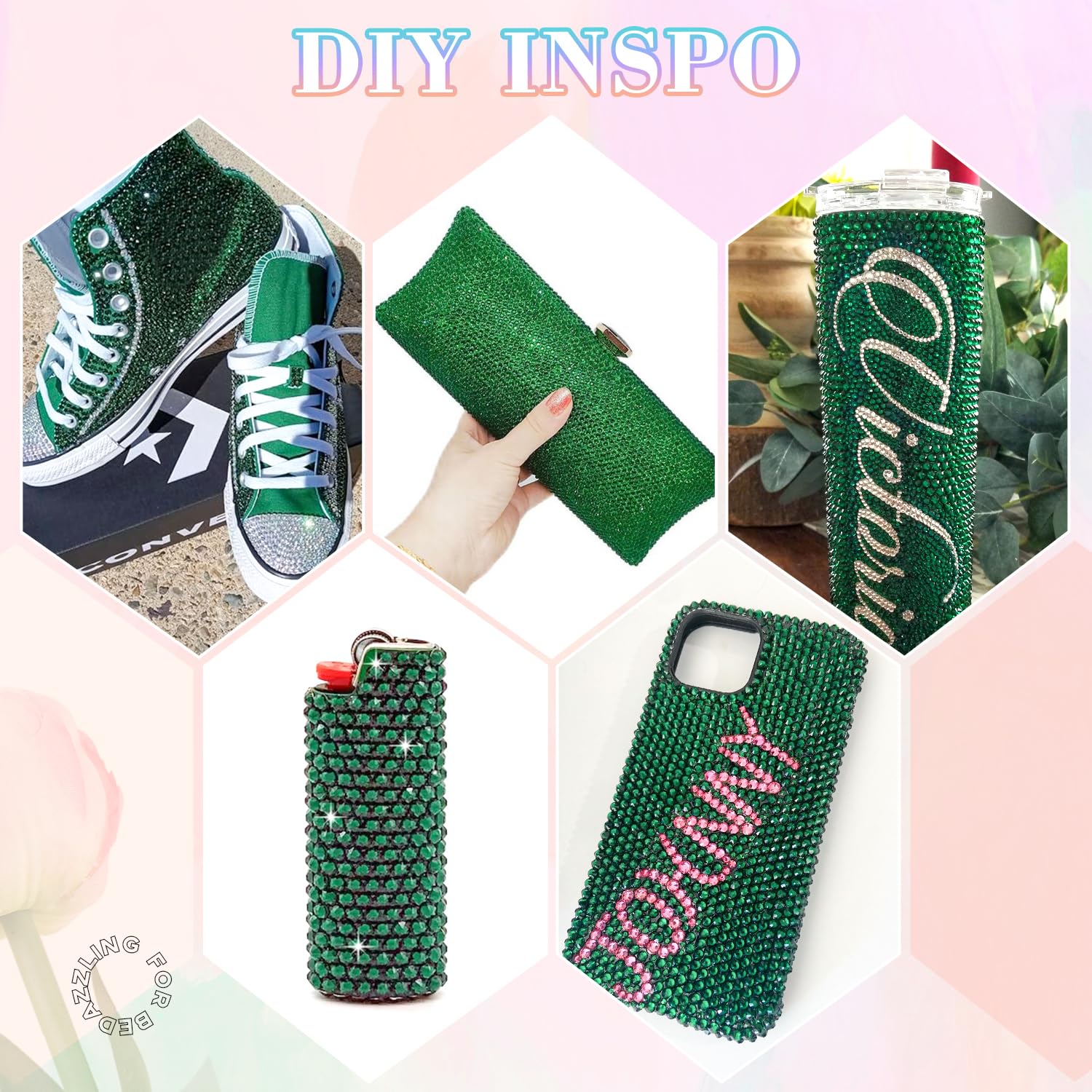 • PACKAGE CONTENT – This all-in-one bedazzler kit includes everything you need to start creating dazzling designs: 1 box of Emerald Green rhinestones with 24 grids (approx. 30,000 pcs of bedazzling rhinestones assorted size SS6/10/16/20/30 ), 1 precision tweezers, 1 pickup pen for handling small gems, and 3 tubes of B7000 jewelry glue for secure application.