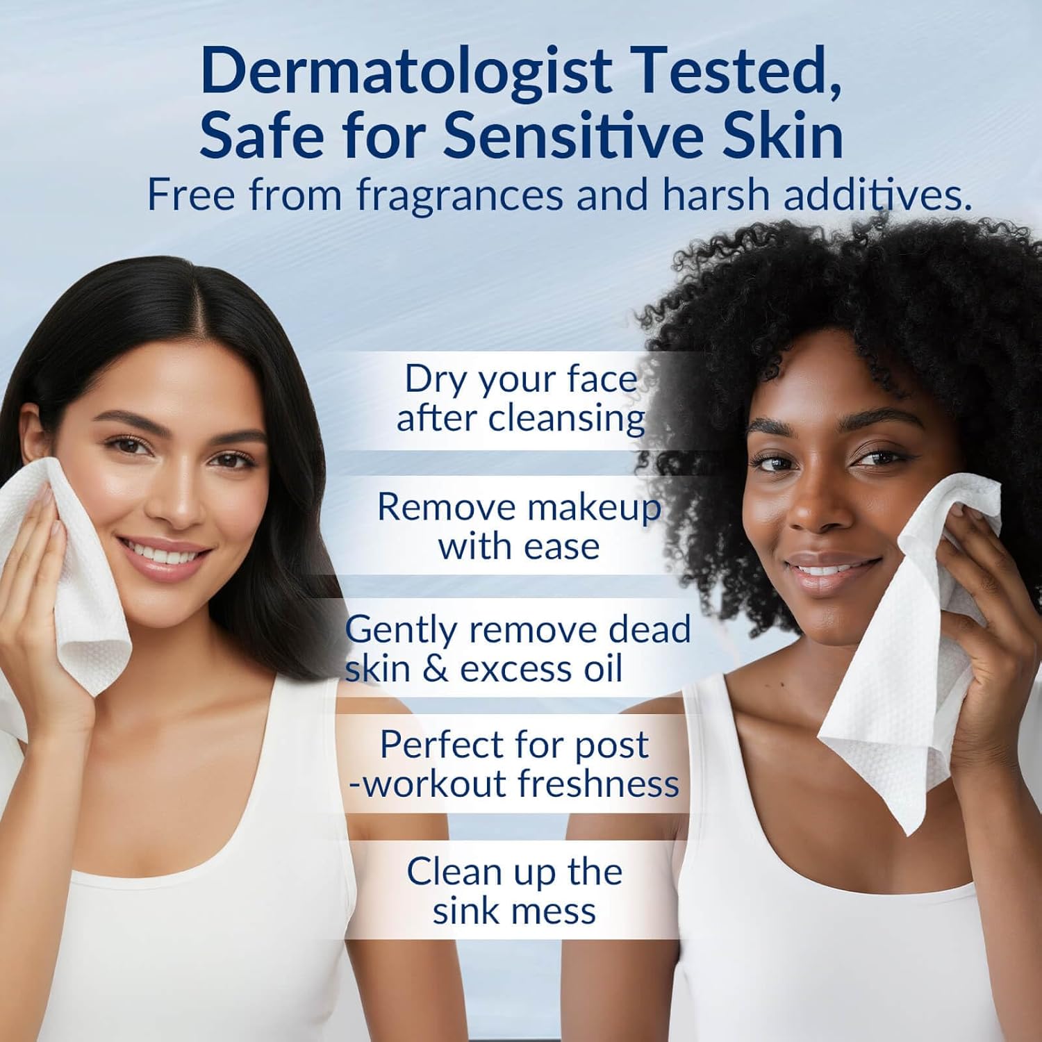 • SKIN-FIRST COMFORT IN EVERY DISPOSABLE FACE TOWEL: Crafted by a skincare-conscious brand, our disposable face towels are free from fragrances and harsh fibers. These ultra-soft washcloths for face provide gentle, irritation-free cleansing, leaving your skin feeling refreshed and nourished.