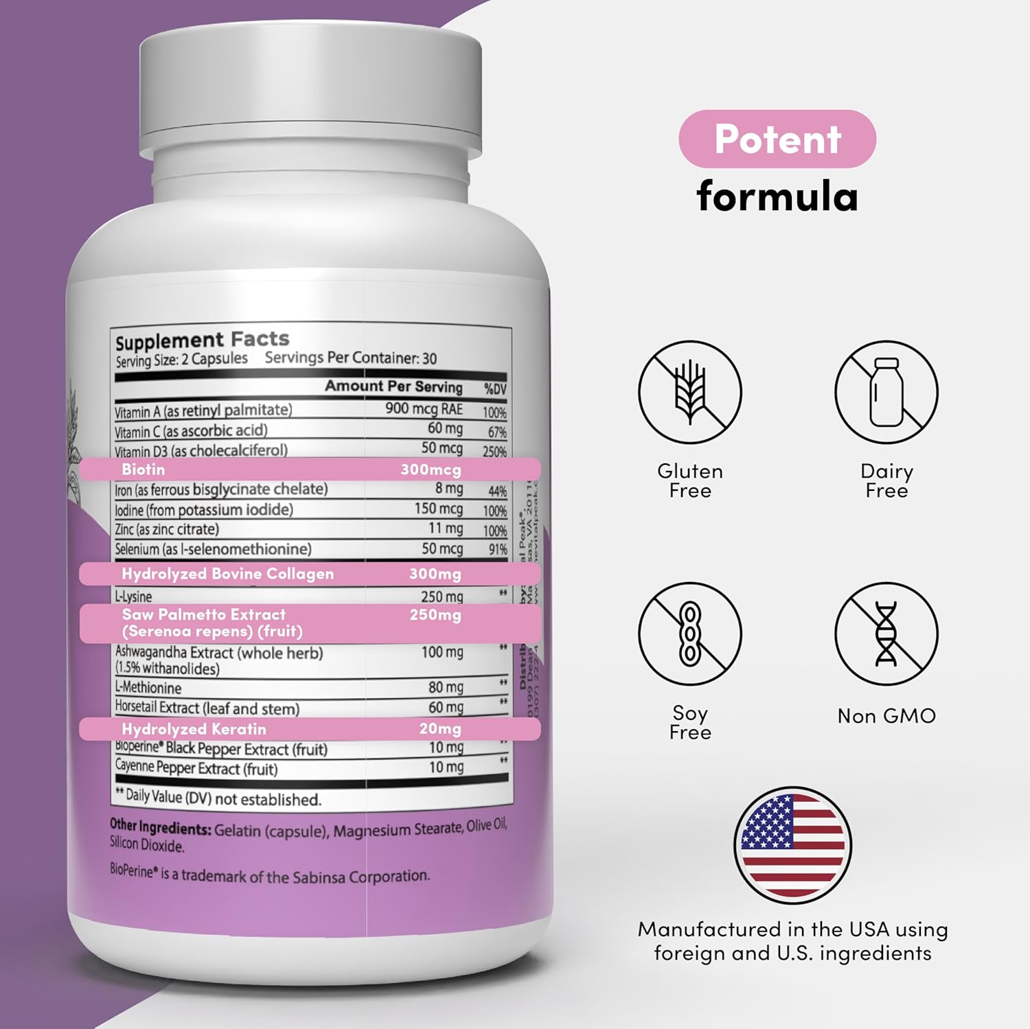 Hair Peak - Hair Growth Supplement - Hair Vitamins to Support Healthy Hair - with Biotin, Collagen, Saw Palmetto Extract, Keratin, Iron, Ionide, Zinc & More - Gluten Free, Dairy Free - 60 Capsules