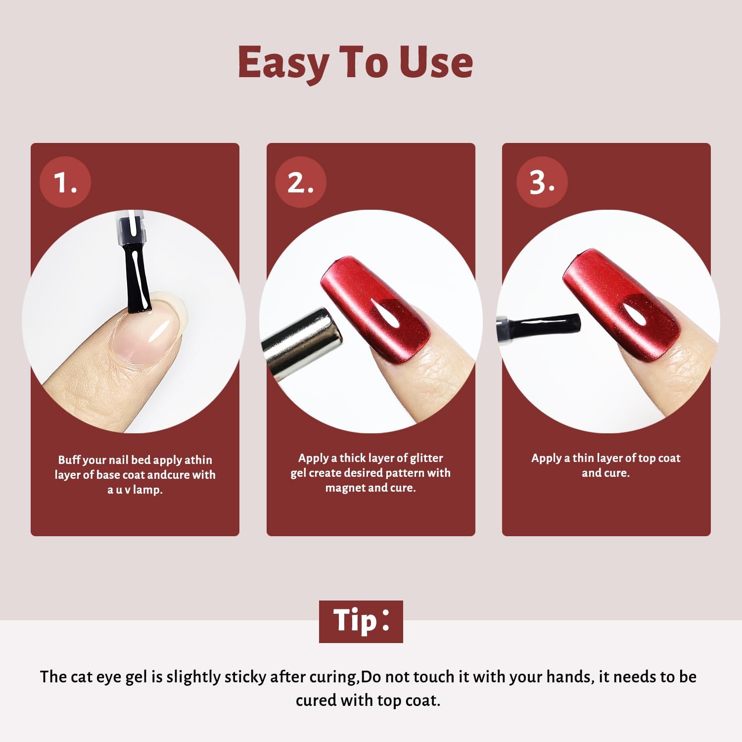 • You’ll Received:1Pcs Jelly (Burgundy Red/Dark Red) Cat Eye Gel Nail Polish.With the built-in Magnet, you can use the magnet to create desired pattern before curing.It creates a gorgeous momentum for your nails.( Need U V Lamp)