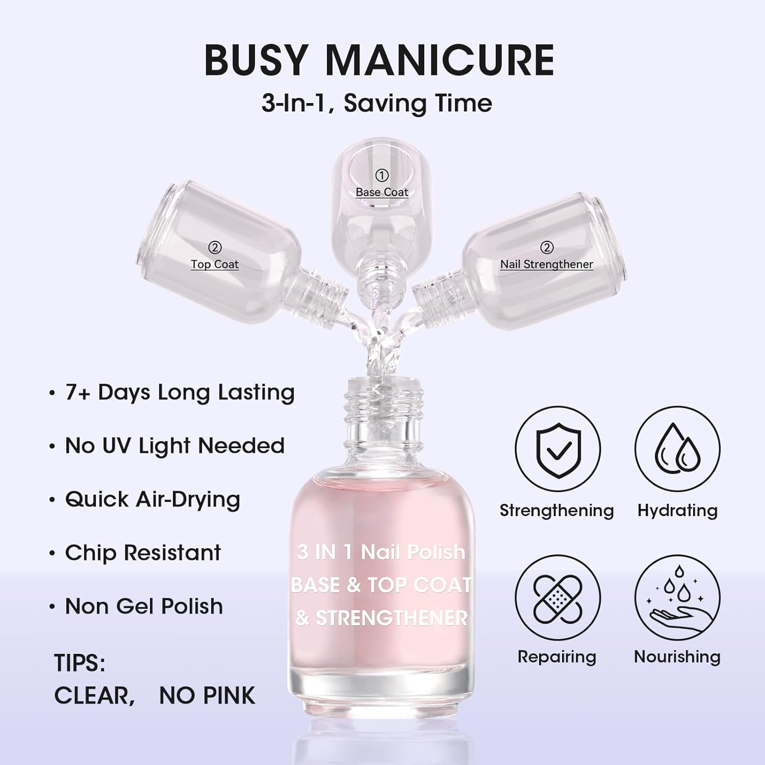 • Model Name : 3-In-1 Clear Nail Polish Base Top Coat & Nail Strengthener, Clear No Pink