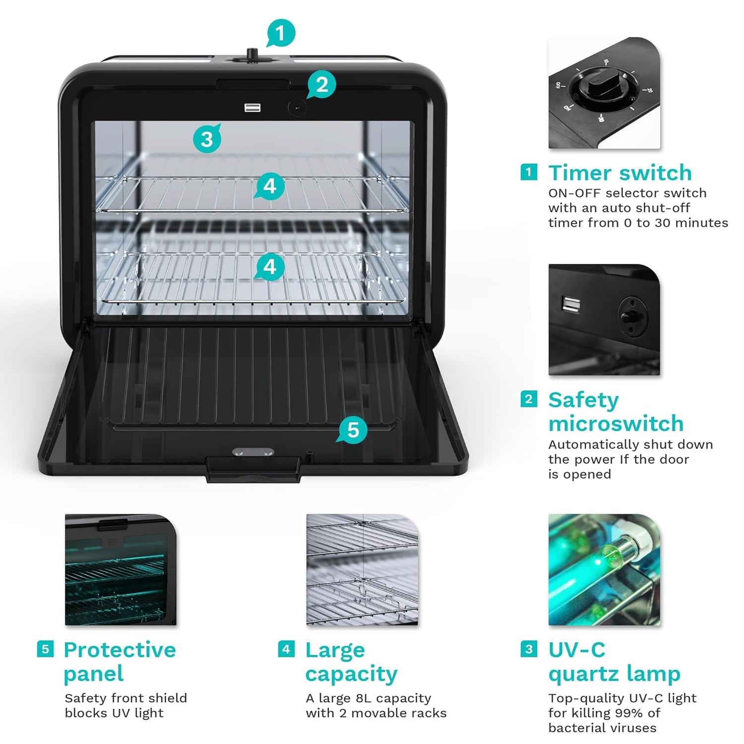 • GET A USER-FRIENDLY SANITIZER: Our UV light cleaner is equipped with a protective panel to prevent accidental scalding, a timer with a 0-30 minute setting, and a safety switch that automatically cuts off the power when the door is opened