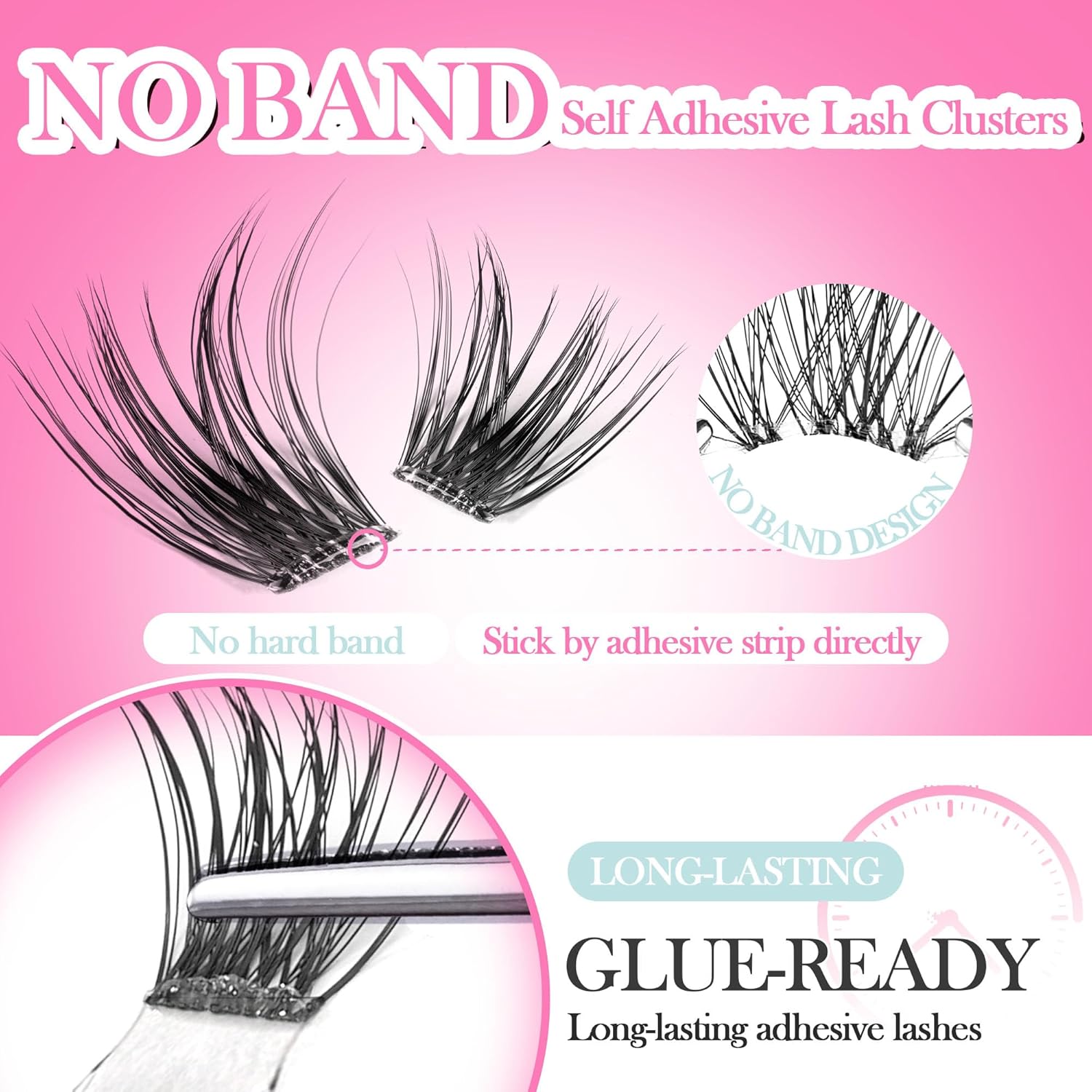 • No Band Design: Unlike traditional glueless lashes with bulky bands, our innovative clusters adhere directly to your lash line via a seamless adhesive strip. This design eliminates rigid bands for a natural, invisible look while enhancing comfortβ€”no irritation, no heaviness, just effortlessly blended volume that feels weightless all day.