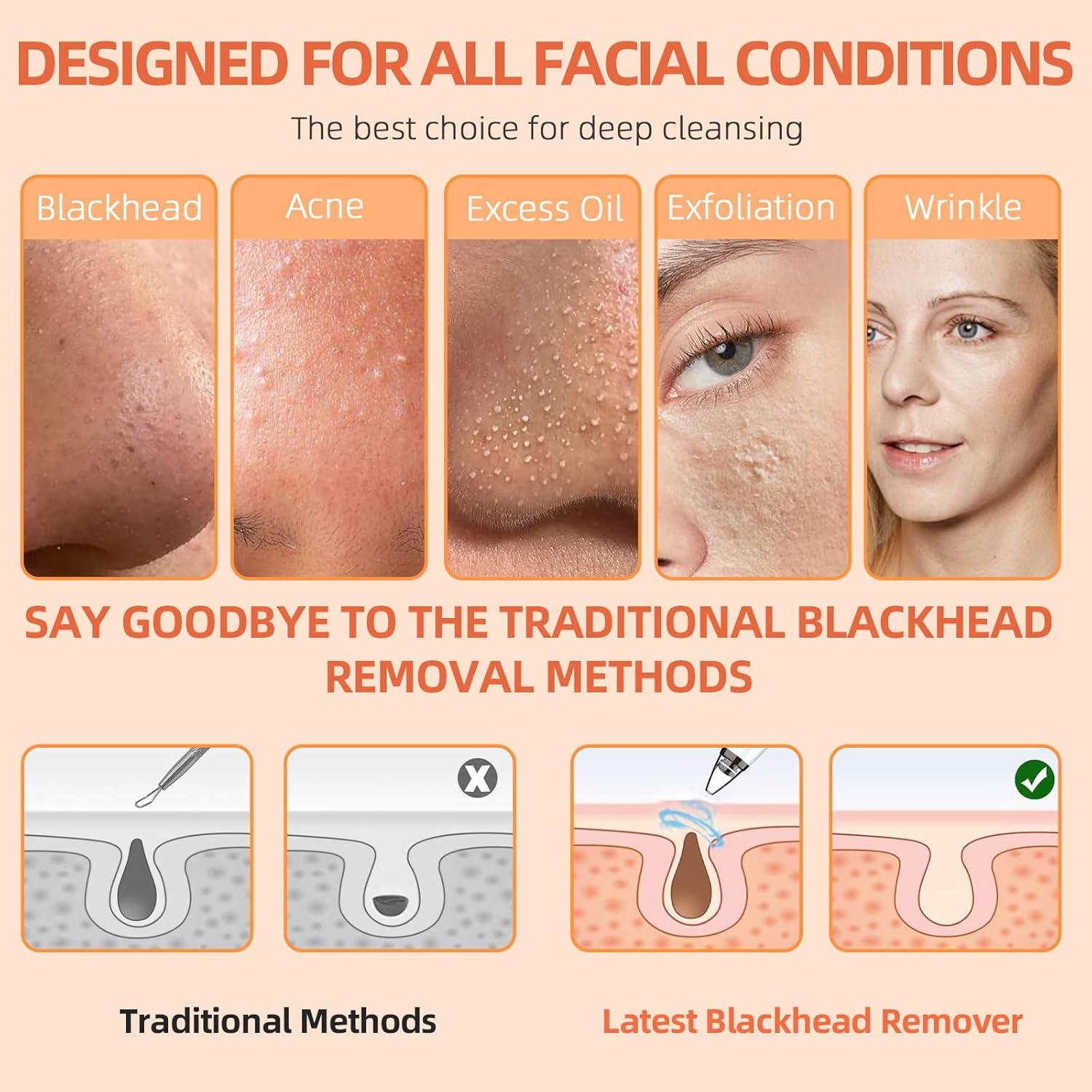 • 【UPGRADED SUPER SUCTION TECHNOLOGY 】Our Blackhead Vacuum Extractor Maximum Suction Power Of 69kpa, Can Be Safely Used On The Face Directly Achieve Deep Cleaning And Effectively Remove Blackheads, Whiteheads, Dead Skin,Grease And MakeupResidues,Shrink Pores And Smooth Fine Lines Without Damaging Skin
