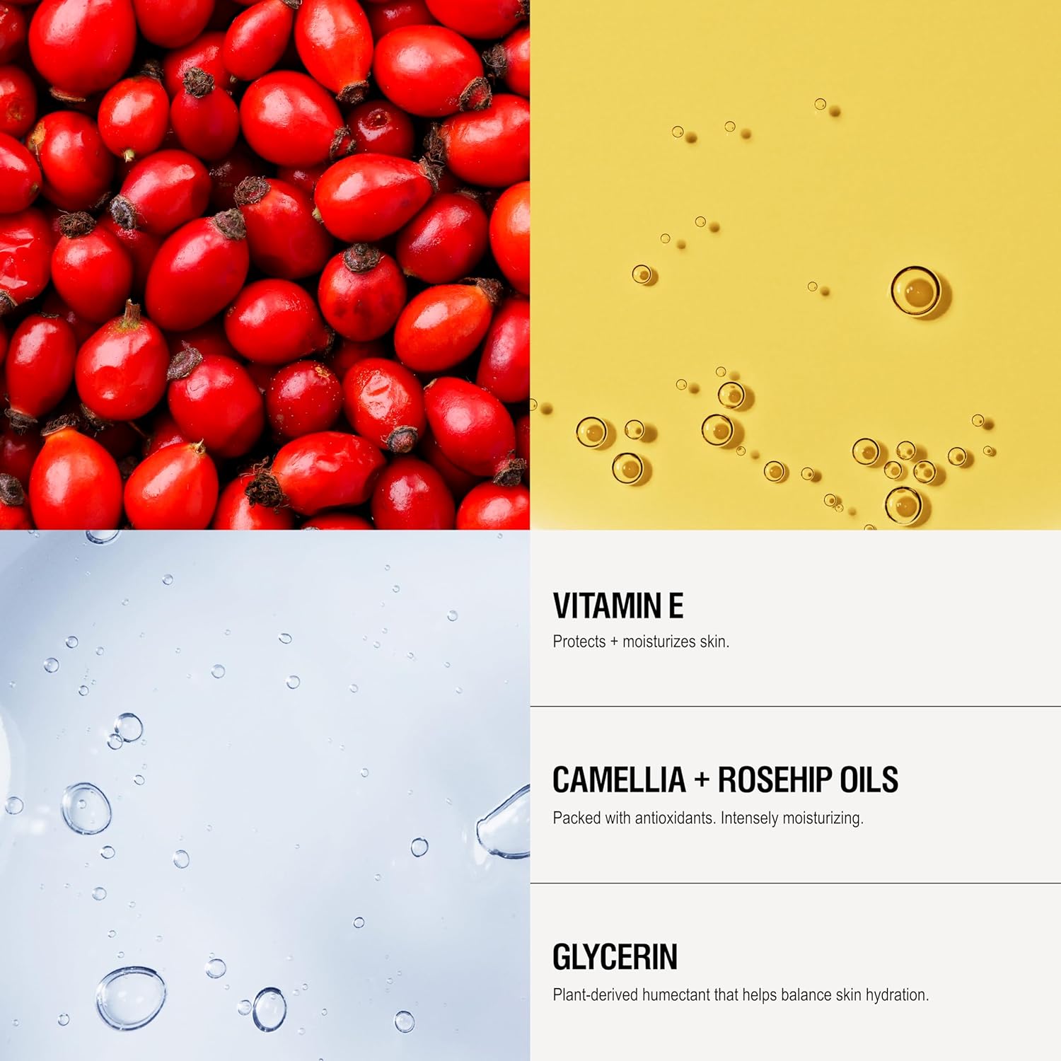 • Fast Absorbing formula. Combines Aloe, Vitamin E & Glycerin, with Geranium & a blend of Camellia, Jojoba & organic Rosehip. Skin looks smooth and plumped with moisture