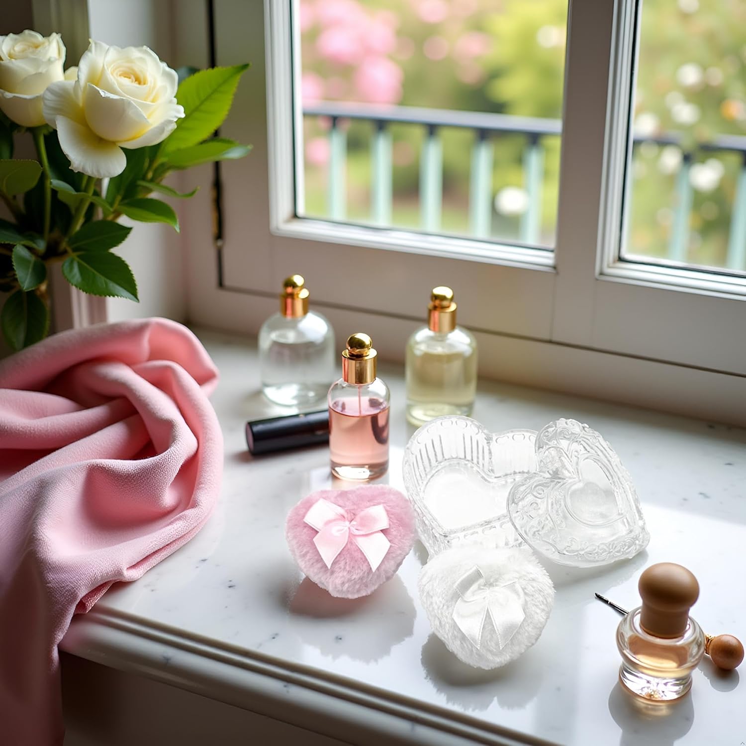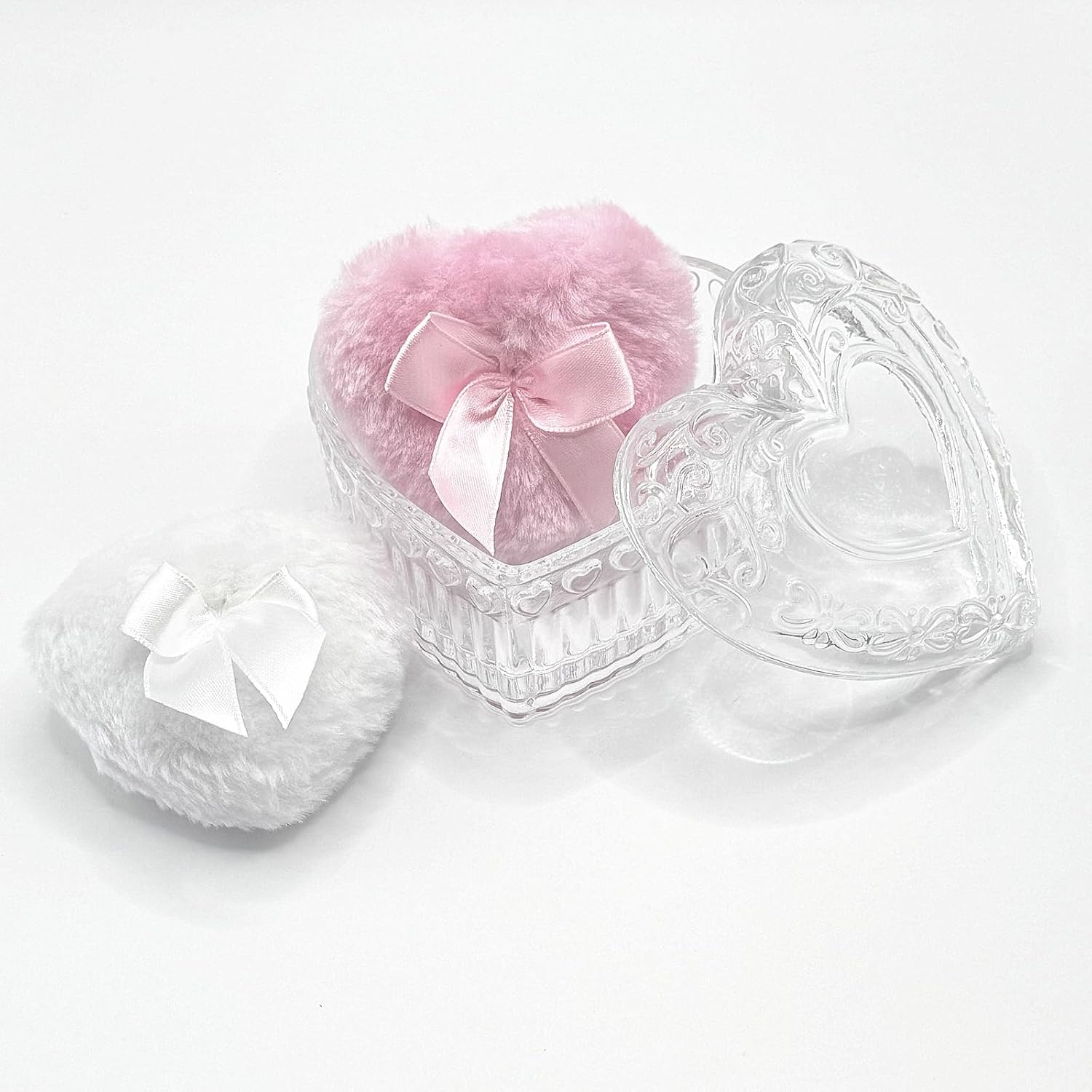 • PACKAGE INCLUDES 1 x Heart Shaped Glass Powder Puff Box with Reusable White and One Pink Puff Transparent glass material with heart shaped design, both aesthetics and ritual, suitable for gifts or makeup table decorations. The tassel is soft and reusable, can be used wet and dry