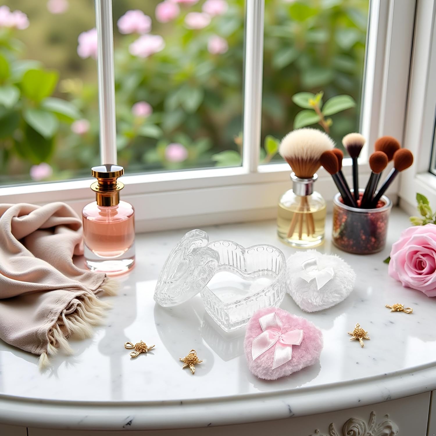 • MULTIPURPOSE GLASS HEART BOX This glass powder puff container can not only be used to organize your powder puffs, but also can be used to store earrings, rings, bracelets, hair accessories, trinkets and other items on your dressing table, bathroom and bedroom. It can keep your items away from dust and water and play a protective and decorative role to meet the needs of female users for cosmetic organization