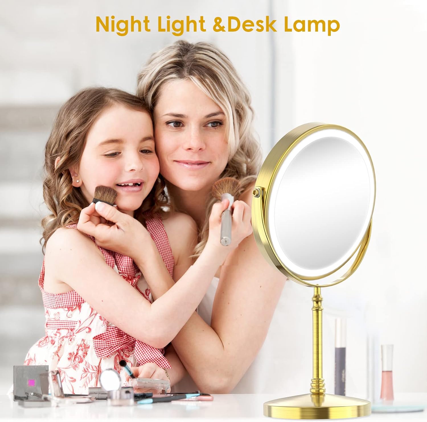 Lighted Makeup Mirror, 3000 mAh Rechargeable Double Sided Magnifying Vanity Mirror with 3 Colors, 1x/10x, 360° Rotation , Brightness Adjustable Magnification Cosmetic Light up Mirror, Women Gift