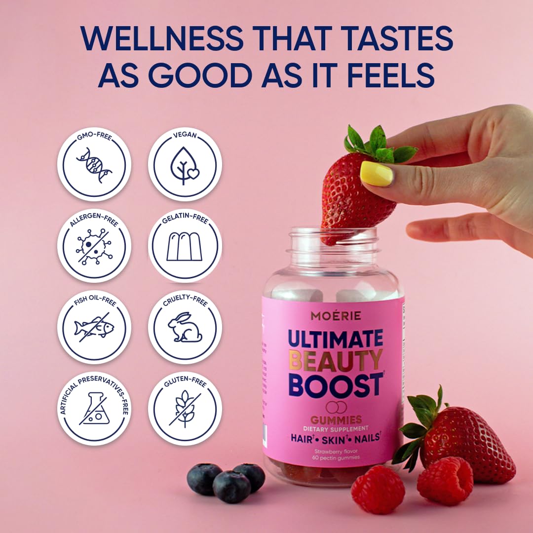 • Wellness That Tastes as Good as It Feels! Upgrade Your Routine With Something You’ll Actually Enjoy — A Sweet Strawberry Biotin Gummies That Makes Beauty Support Fun Again. Packed With High-Potency Biotin, Vitamins C & E, and Clean Ingredients You Can Trust. Moerie Hair Nails and Skin Vitamins for Women and Men – Support Radiant Hair, Glowing Skin, and Strong Nails in the Most Delicious Way.